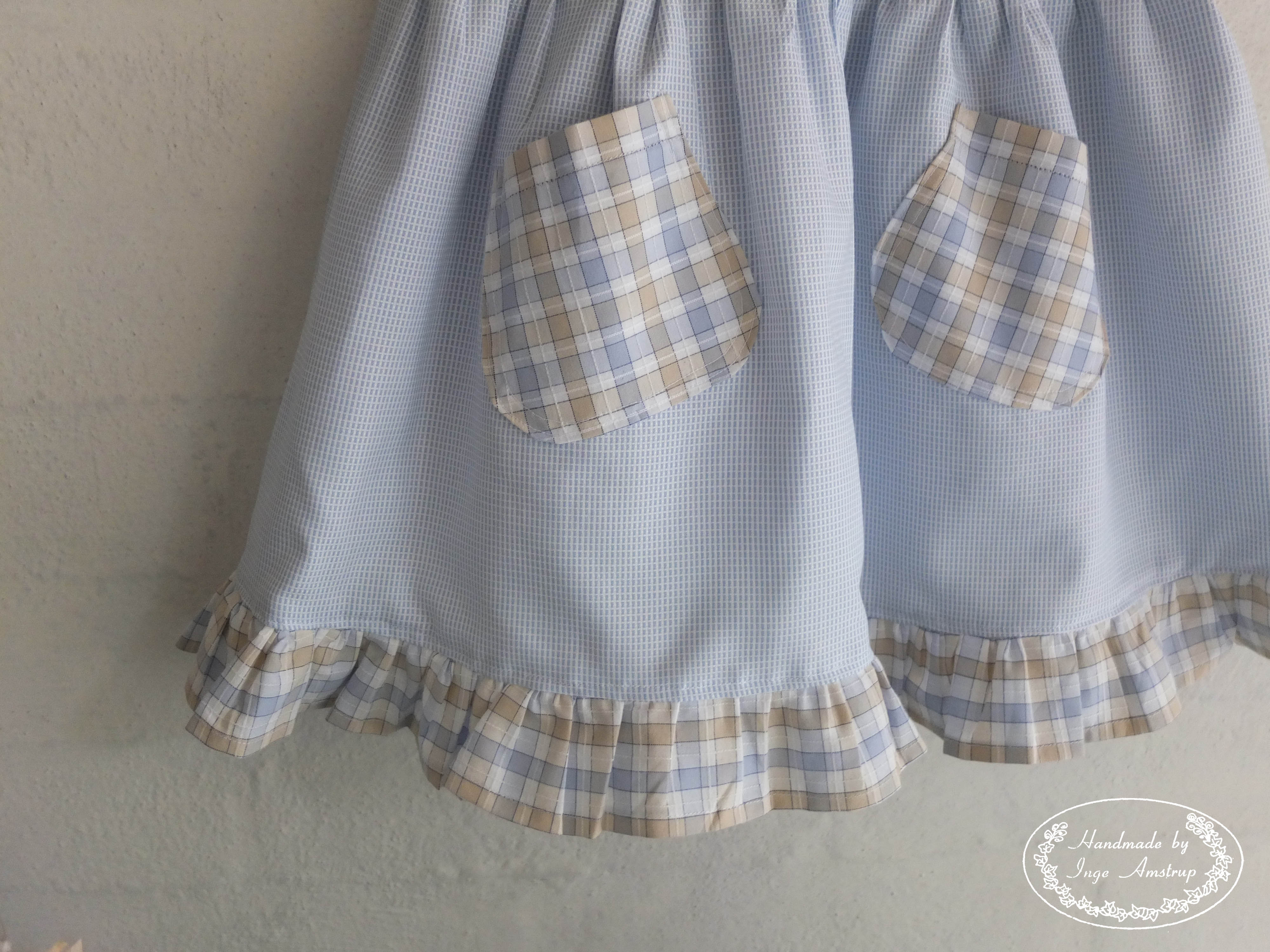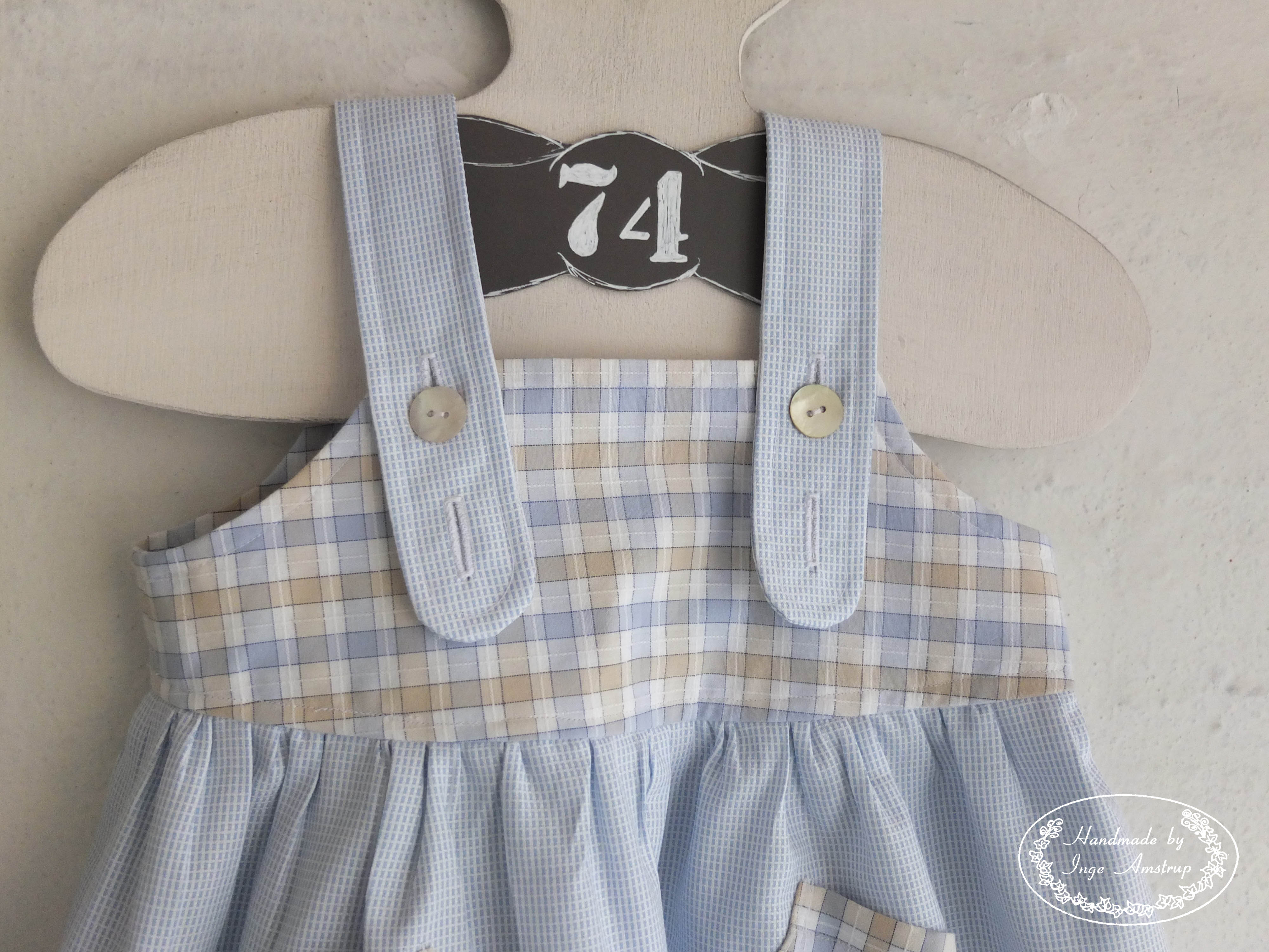 Lille-pige spencer i genbrugsbomuld. Kjolen er en størrelse 74 og lavet af en antikke bomuldsskjorter i beige og lyseblå nuancer. Alle kjolerne er unika-design, men jeg laver gerne bestillinger efter særlige ønsker.