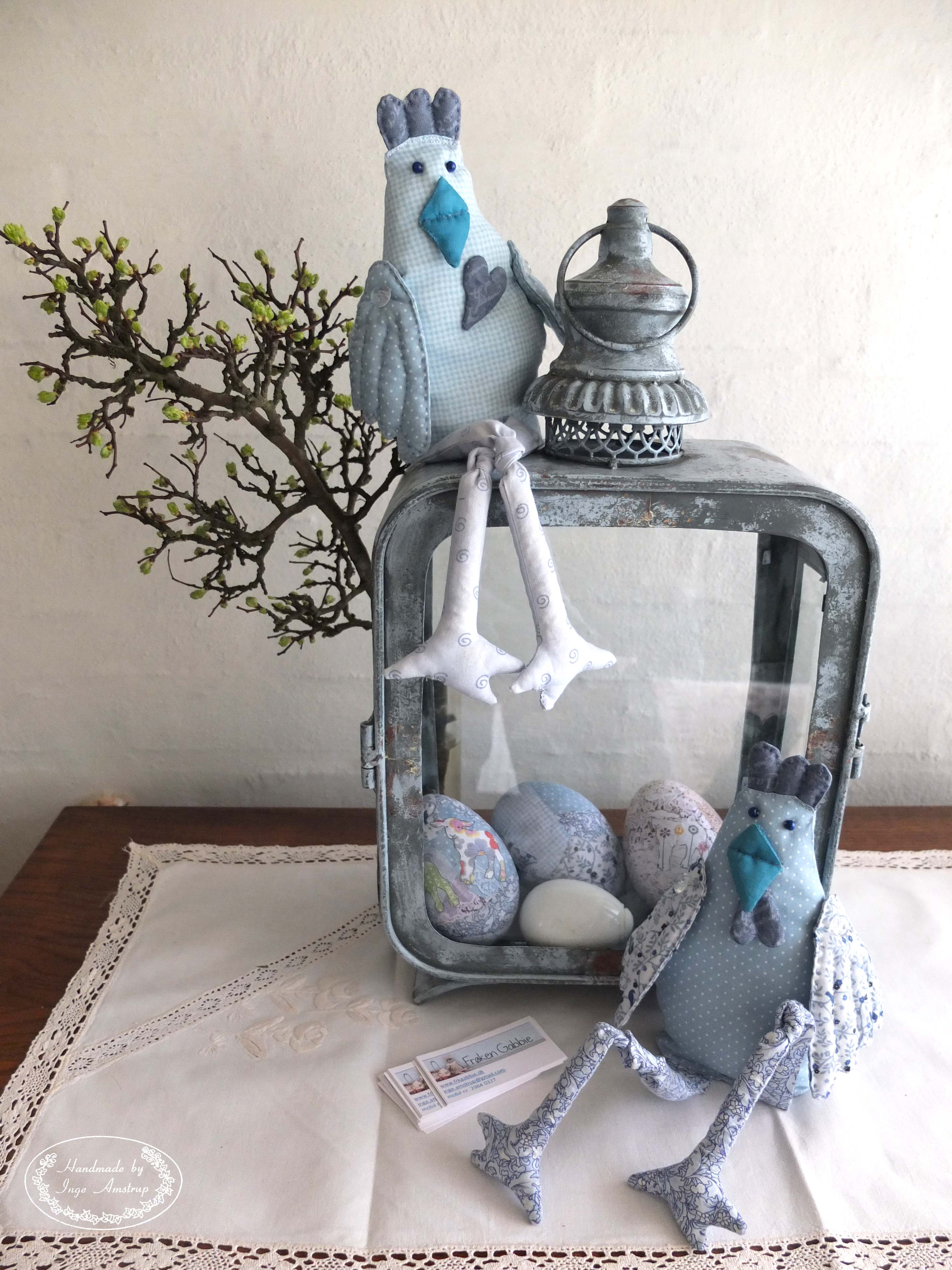 Fru Høne og hr. Hane er syet af blå patchwork stoffer efter en opskrift i hobbybogen: ”Liv i kludene, sy, quilt og appliker” af Anne-Pia Godske Rasmussen. Flamingo æggene er lavet med decopage, stofrester er fotokopieret, klippet/rykket i småstykker og derefter limet på æggene. Lanternen er købt hos Årstiderne i Tilst.