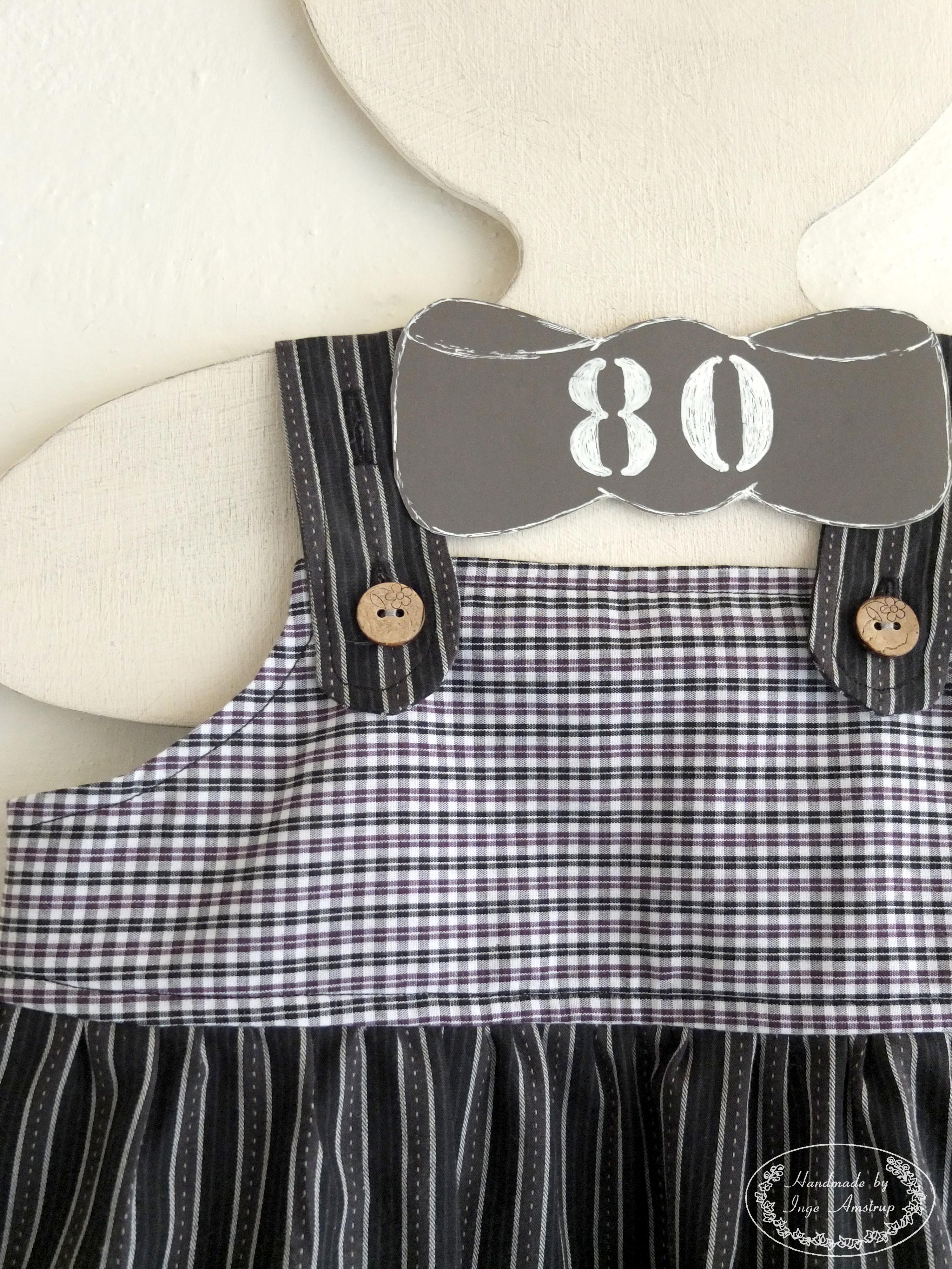 Denne lille-pige kjole er syet af dejlig bløde genbrugte herreskjorter. Den er i grå-sorte tern og striber og kunne være flot sat sammen med en lilla bluse under, da der er lidt lilla nuancer i bærestykket.