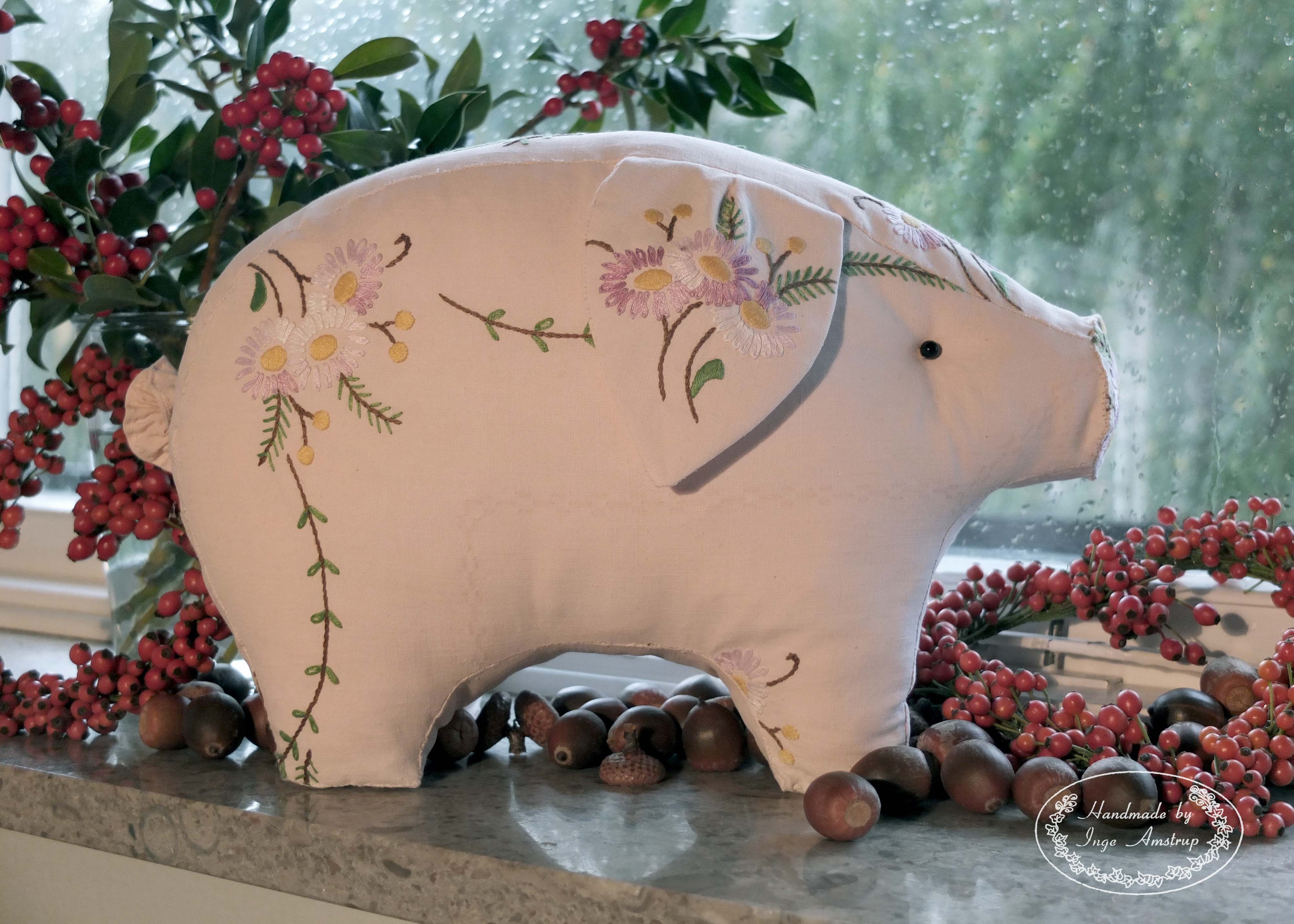 Julen nærmer sig, det kan man bl.a. se på diverse dameblade. Jeg tænkte straks på julegrisen, som jeg længde har drømt om at sy i en blød udgave. En gammel lyserød broderet dug fra mormors tid har længe ligget og ventet på, at den skulle blive til en glad julegris.