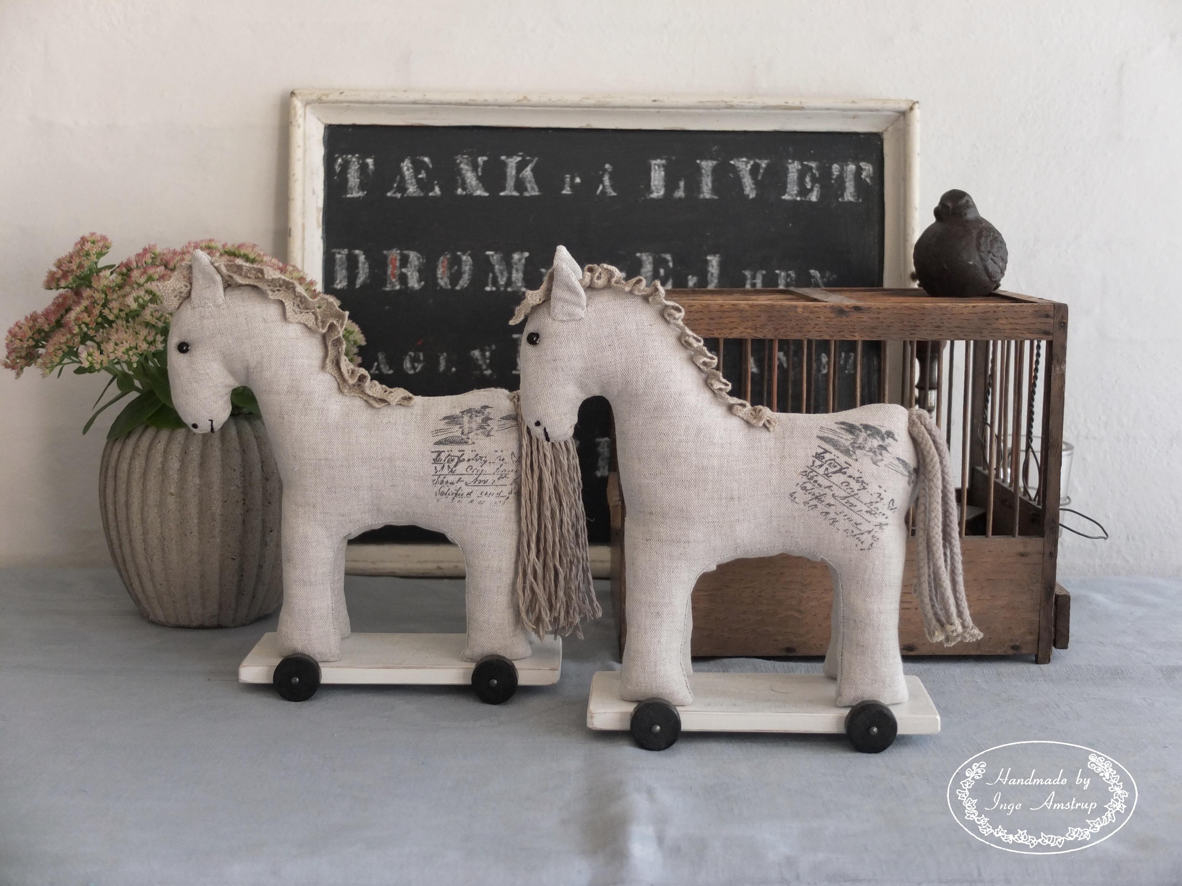Endnu to skønne tøjheste: Cille og Ditte. De er syet i naturfarvet hørstof, har fået man af naturfarvet blonde og Cille har hørgarn til hale, mens Ditte har fået sin hale fra en rest af naturfarvet anoraksnor. De har fået et printtryk på begge flanker som dekoration. Tøjhestene er ca. 20 cm høje og står så plade og hjul af træ.