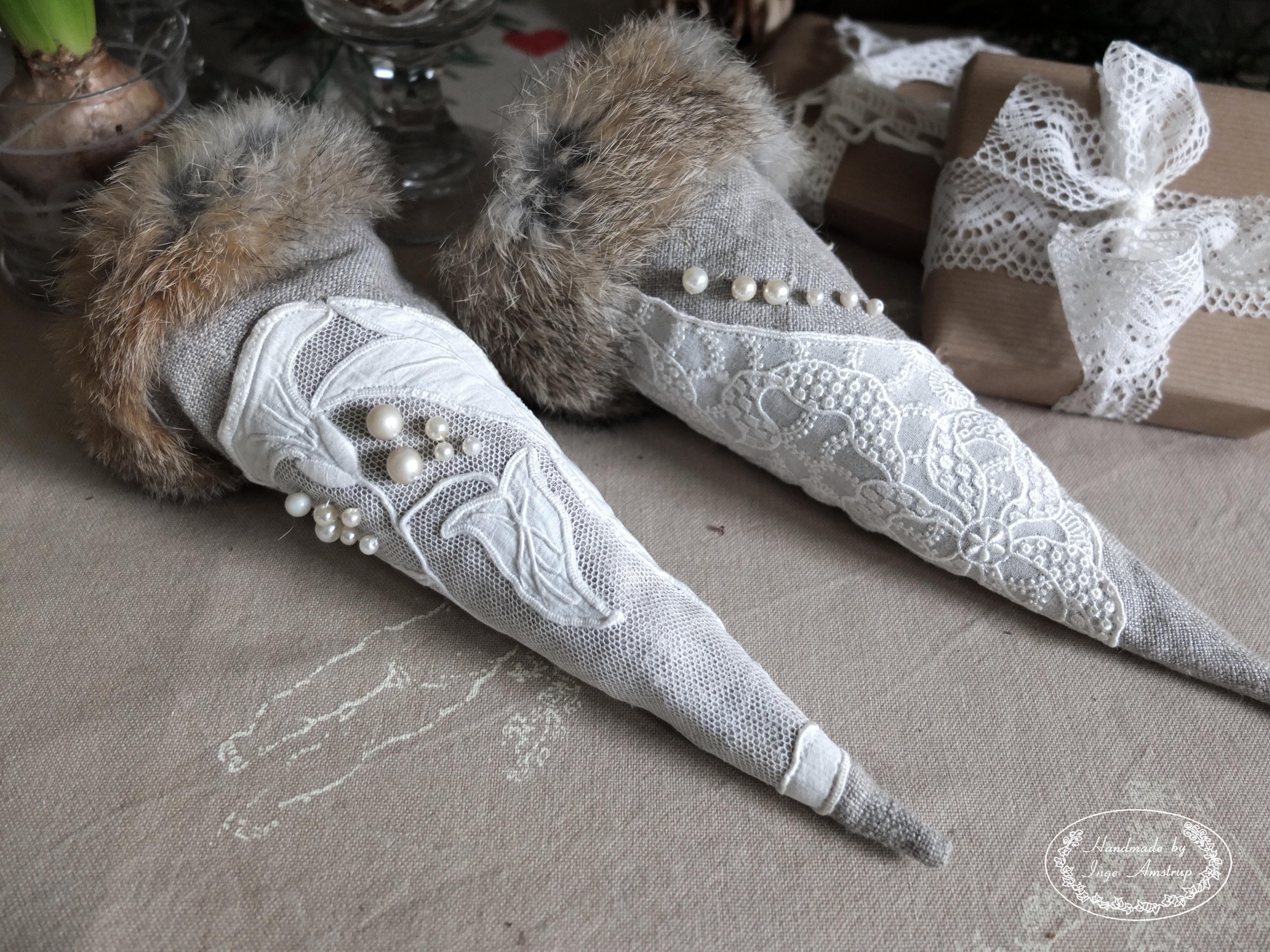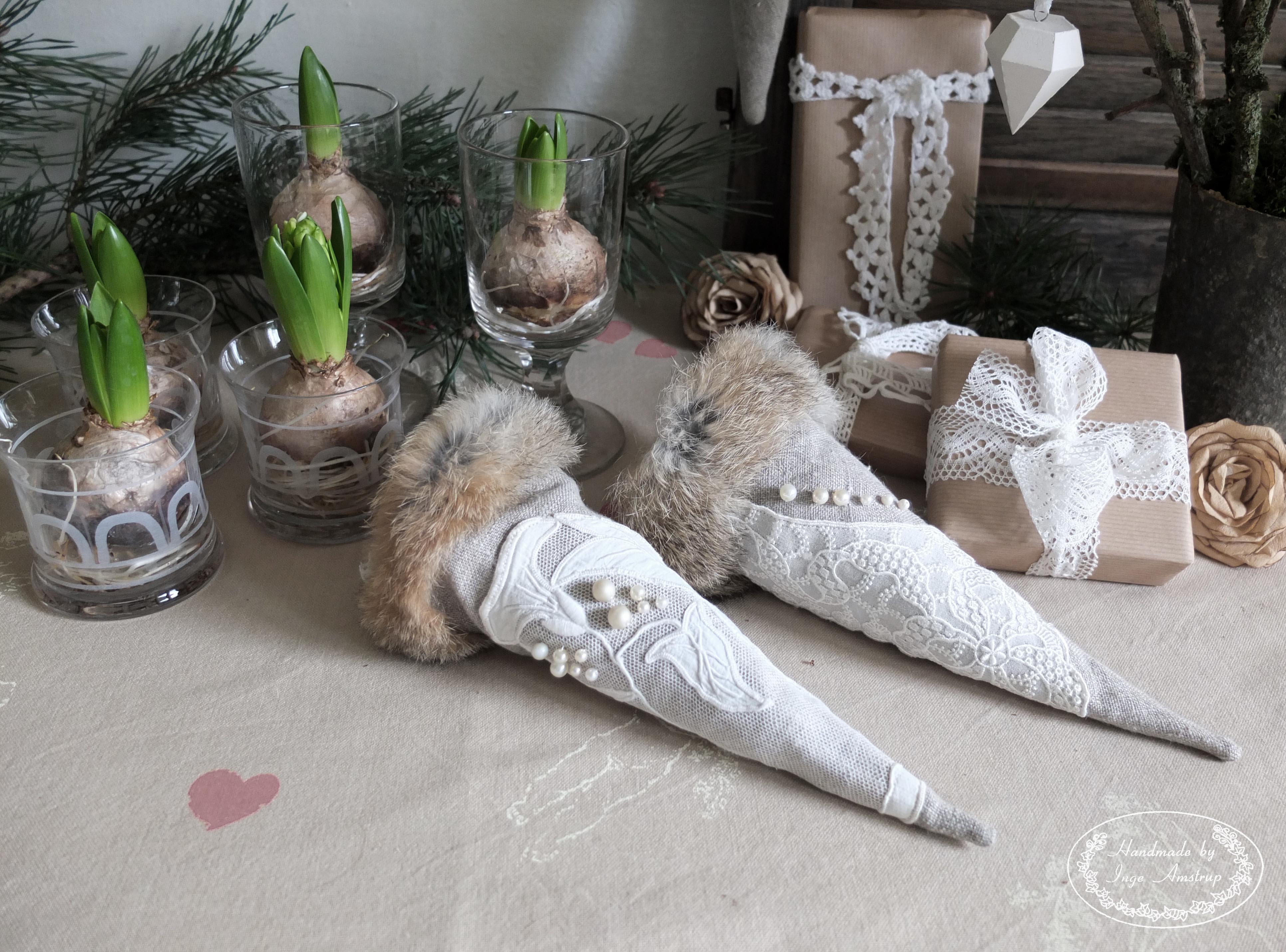 Kræmmerhuse i hørstof med kaninpels foroven. De er dekorerede med gamle blondekraver og perler fundet i en genbrugsbutik. Indvendig er kræmmerhusene foret med hvid lagenlærred.
