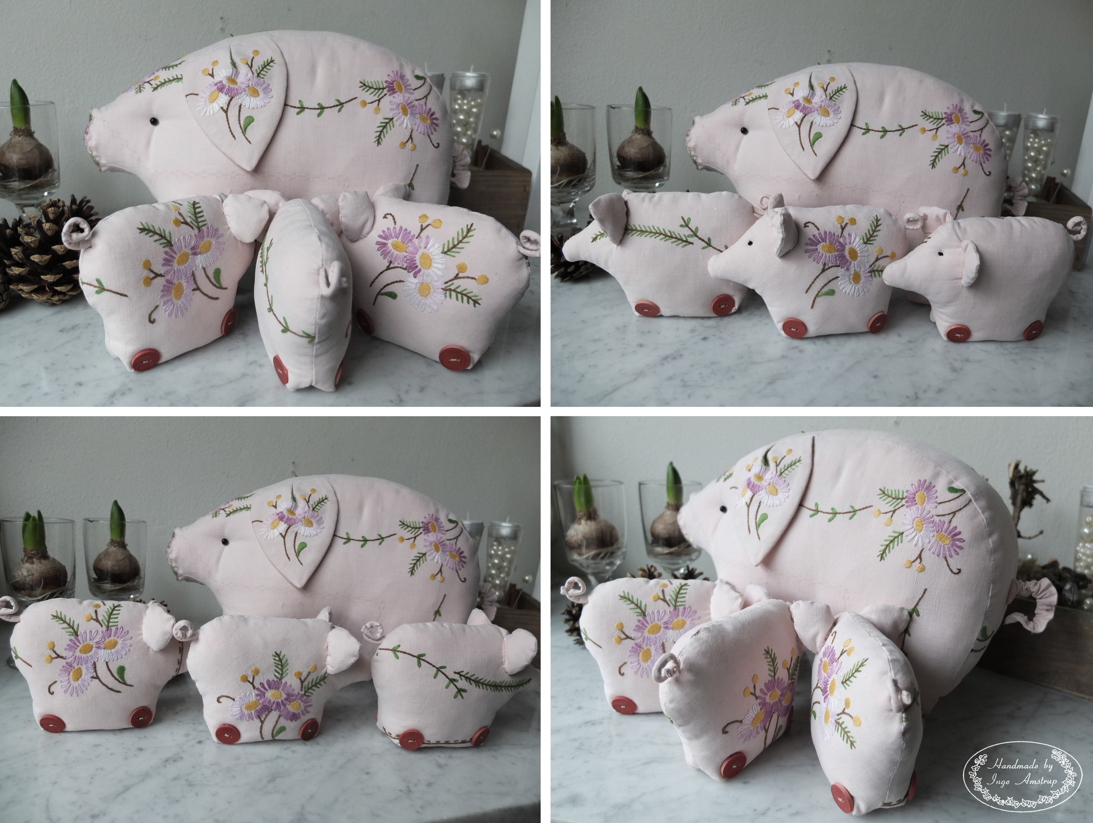 3 små dejlige grise kunne der blive af resten af stoffet fra den lyserøde dug med blomster broderierne. De har fået knapper som hjul. Mønstret er fundet i den sidste nye Tilda bog, som udkom her til jul. De er nu klar til at flytte hjemmefra.