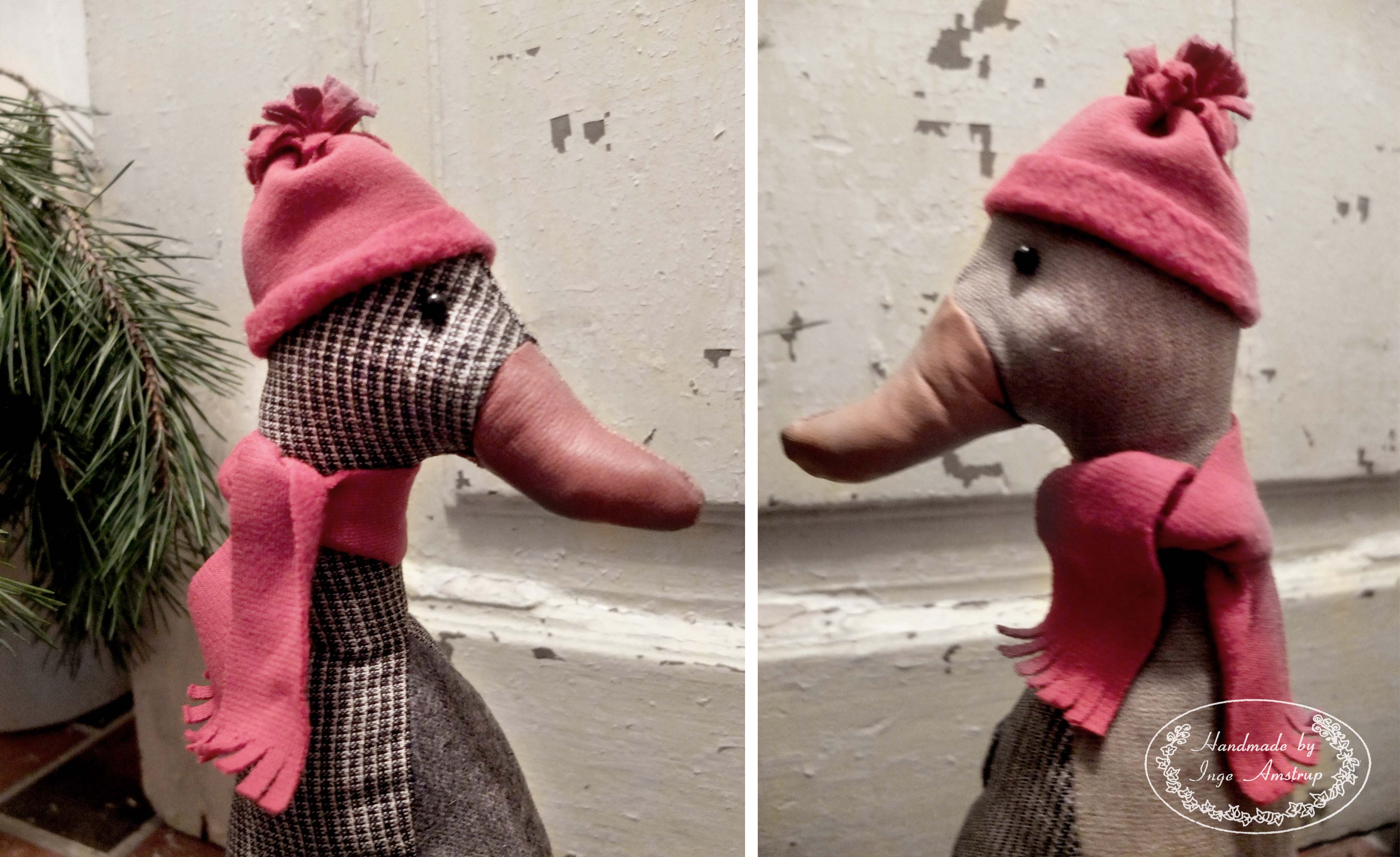 To glade juleænder, som undgik at blive slagtet og ende som julemad. Ænderne er syet efter et mønster i “Alt om Håndarbejde, Julen 2013″ og lavet af stofrester fra div. genbrugs habitjakker. Næb og fødder er lavet af indfarvede skindrester. De har fået en lille pose med ris inde i bunden, så de sidder stabilt. Nissehue og tørklæde kan jo tages af efter jul, så er de dekorative året rundt. Højde ca. 30 cm. Pris pr. stk. 150 kr.