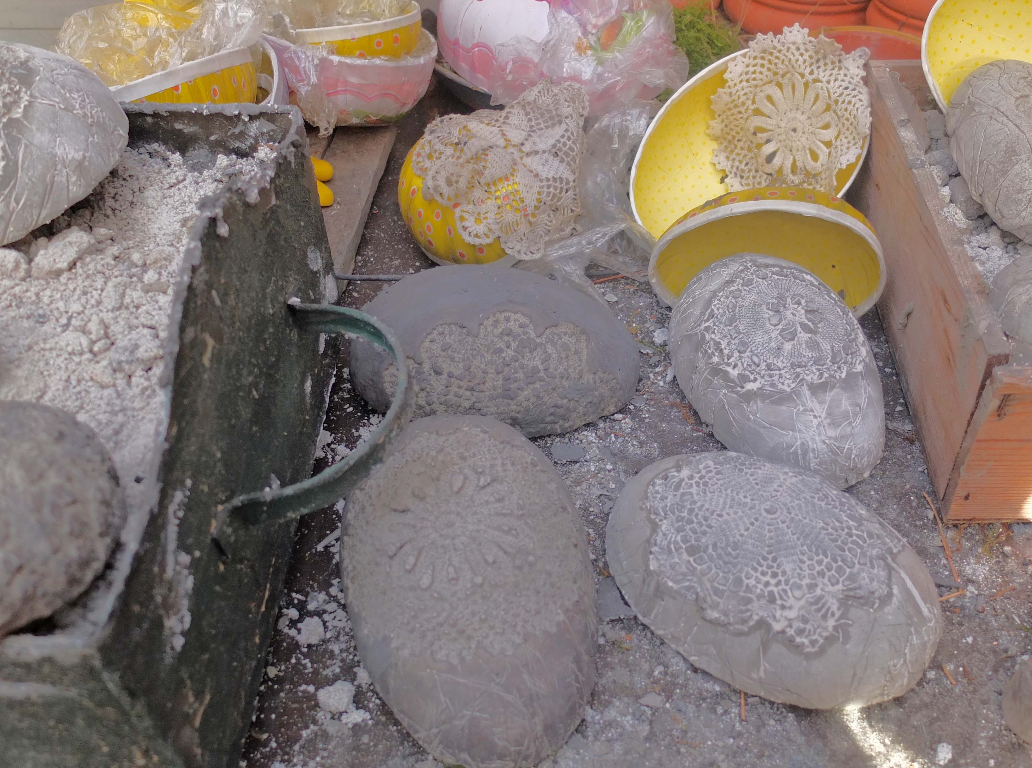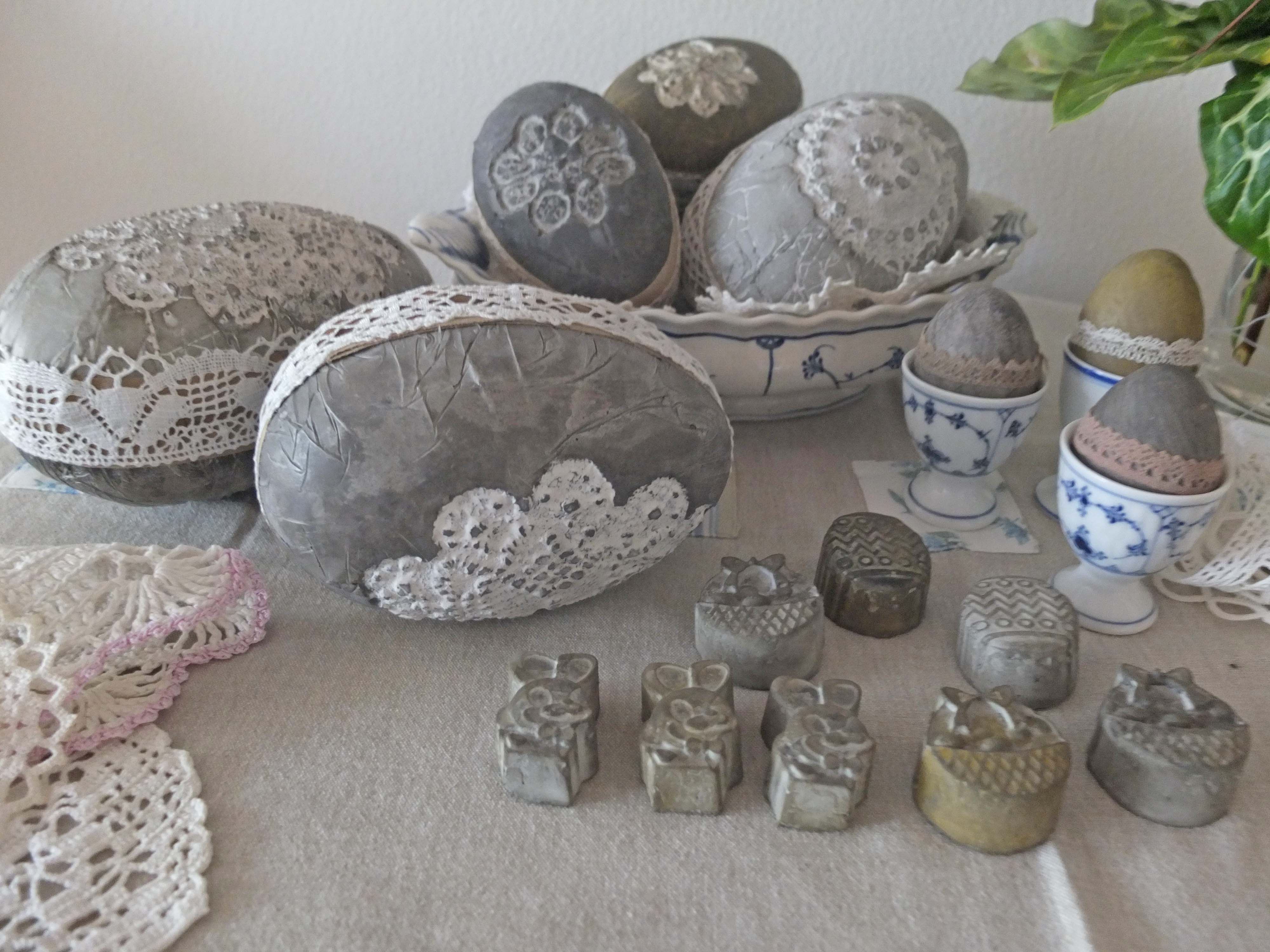 I år har jeg forsøgt at støbe nogle rustikke påskeæg i beton. Jeg fandt nogle af mine gamle pap æg, dem som kan deles i to halve. Først blev de beklædt med husholdningsfilm, derefter blev de smurt med madolie og nogle gamle blonder og flakoner, godt smurt ind i madolie ligeså. Betonen blev hældt i og har så stået et par dage og hærdet, inden jeg tog de halve æg ud af formene. Derefter har jeg limet dem sammen to og to og givet dem en fin blonde udenom.