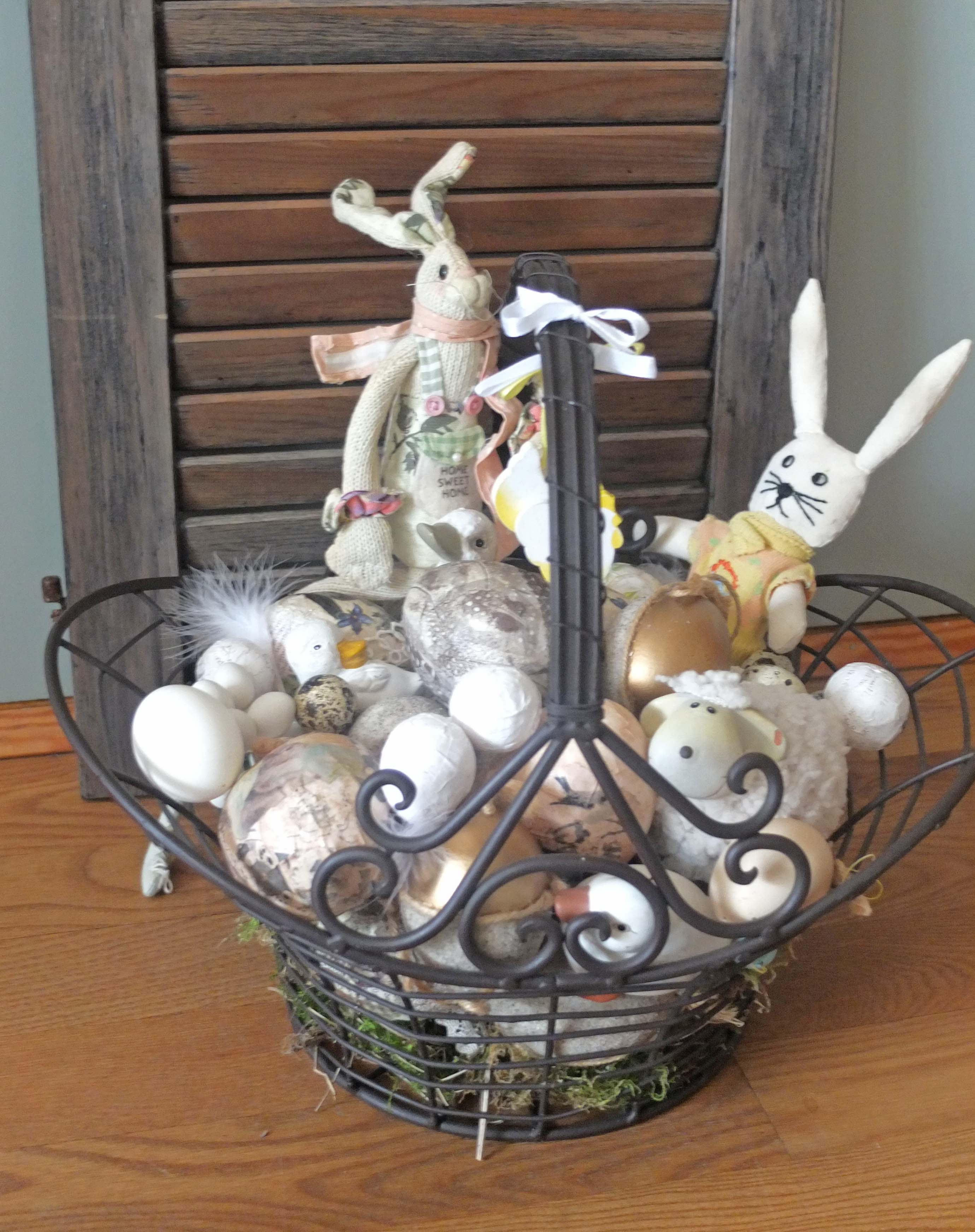 Find en sød og dekorativ kurv, eventuelt lidt åben, kom mos eller tørre græs i bunden. Hent diverse påskeæg og påskepynt frem fra gemmerne og arranger det hele lidt festligt. Det er da en nem måde, uden at skulle op og kravle og hænge pynt op med tegnestifter ol.