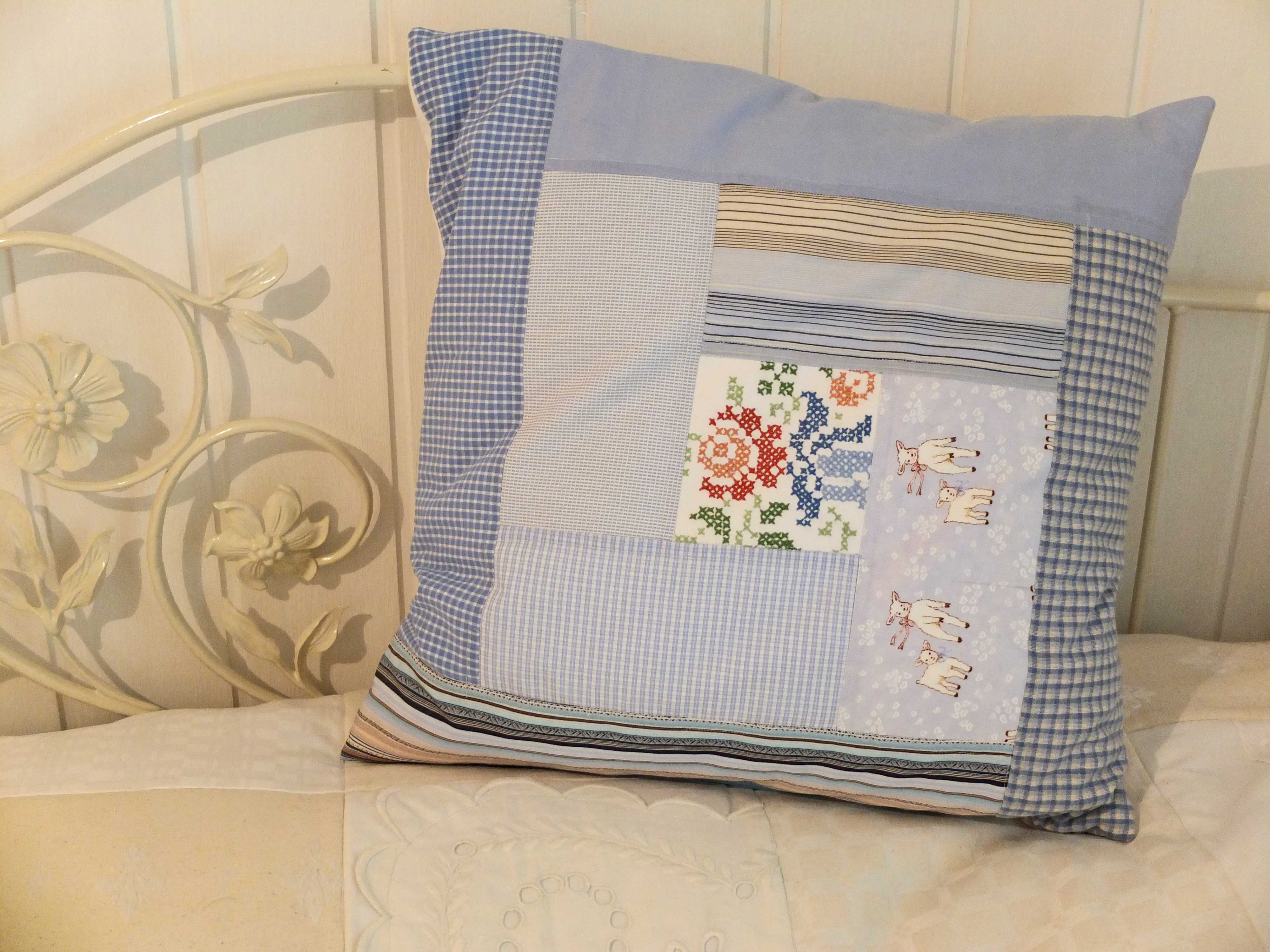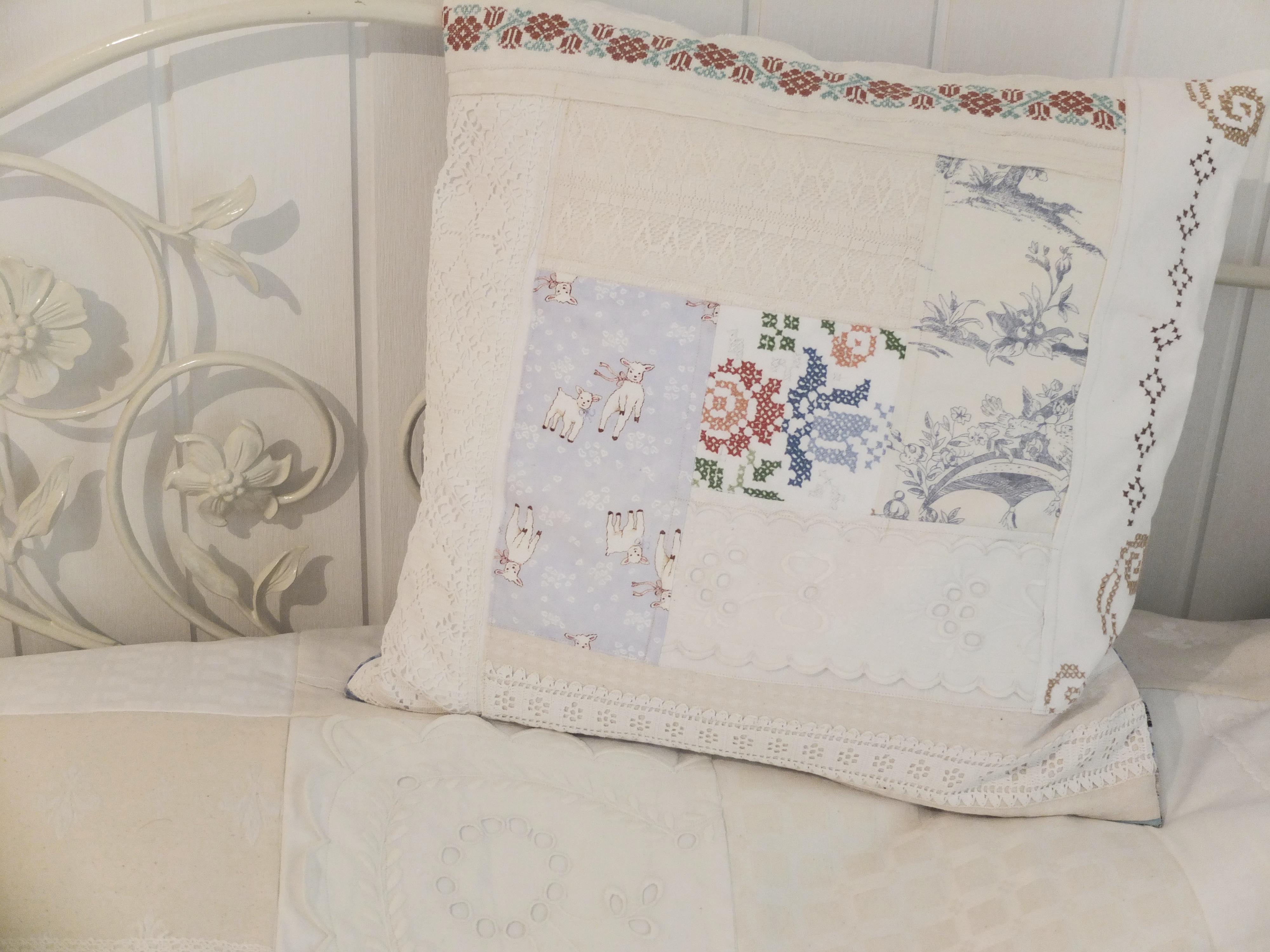 Sommerpude i patchwork. På den ene side er det blå farver og på den anden er det hvide farver med blonder og broderi. De blå farver er mest fra gamle skjorter, mens de hvide stoffer er fra gamle duge og puder. Det blev kun til denne ene pude i størrelsen 45×45 cm. Den kan købes som kun pudebetræk til 150 kr. eller med pude til 200 kr.