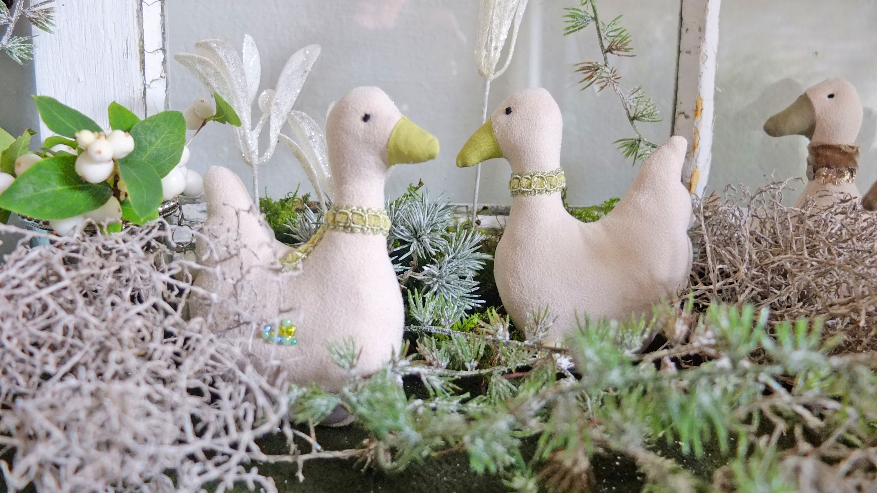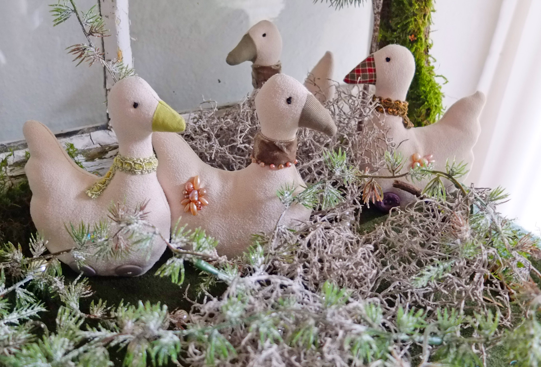Alle disse små stof ænder er rigtig fine på et veldækket julebord, de er dekoreret med bånd og perler og forskellige farver næb. Alle er forsynet med fire knapper for at symbolisere hjul.
