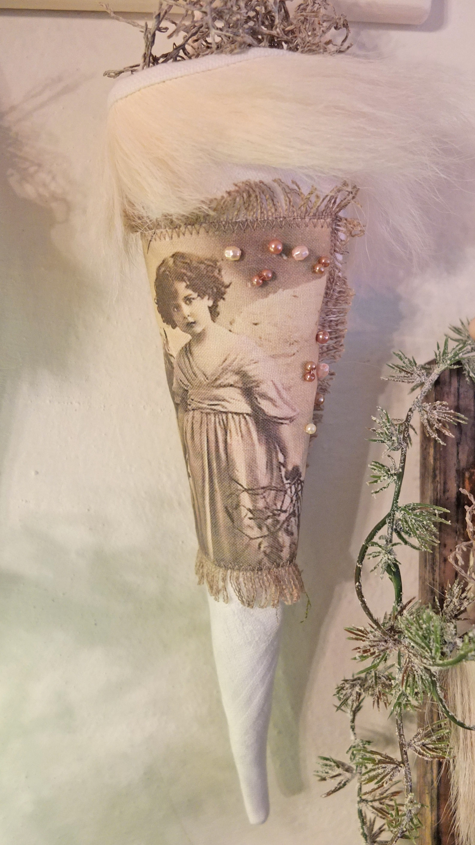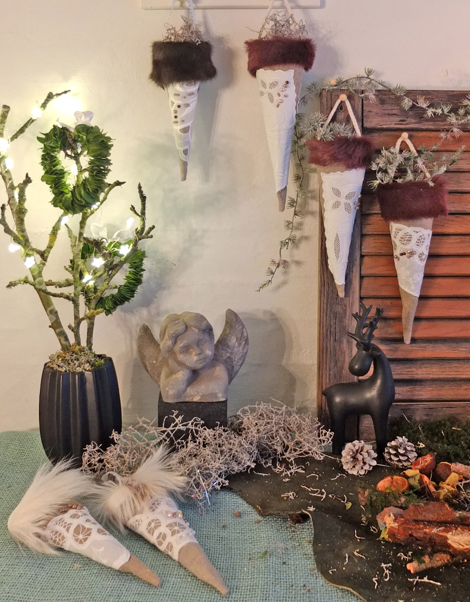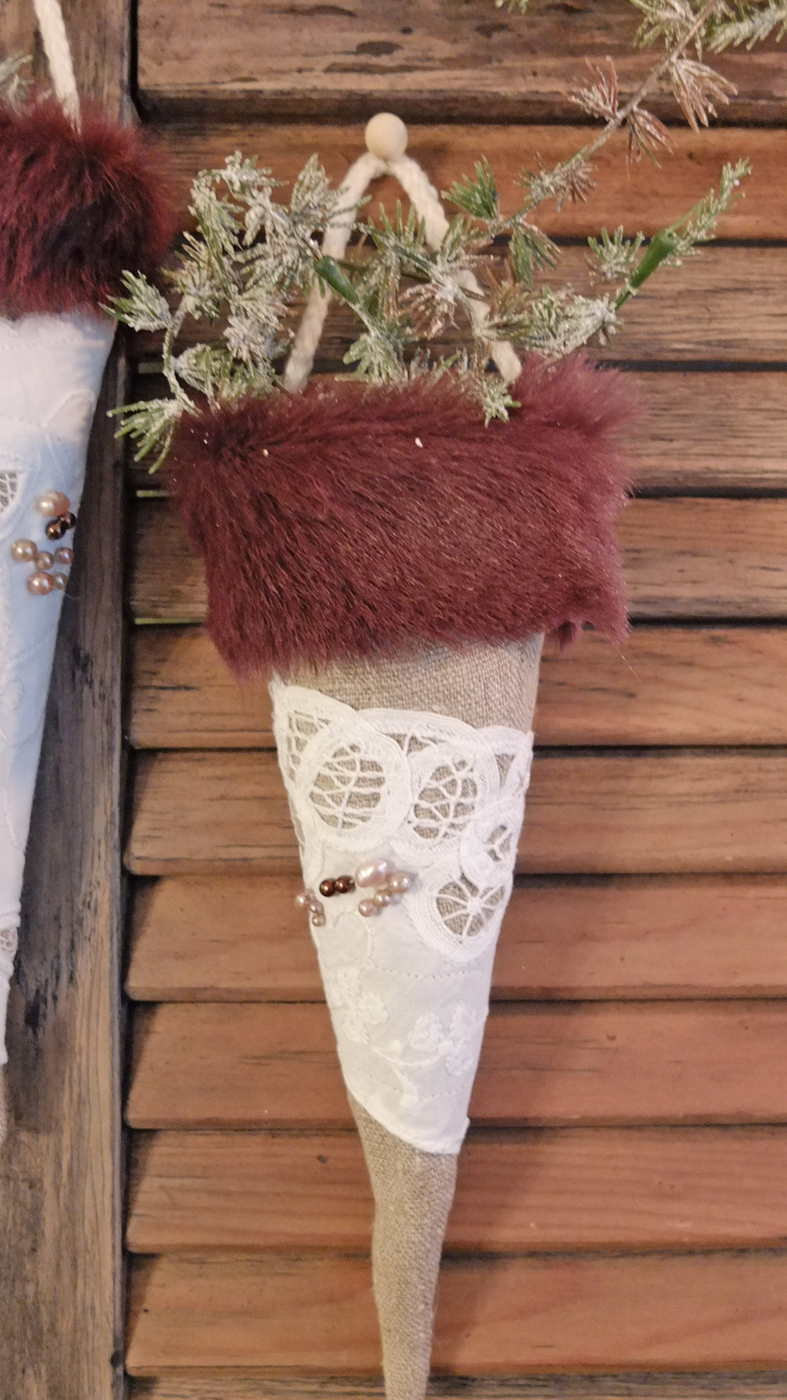 Som julen nærmer sig, så kommer man også til at tænke på engle og romantiske kræmmerhuse. Her er både nogle med engle og andre med gamle blonder, alle har en eller anden ægte pelskant foroven. De er dekorative på en knag eller på nøglen på det gamle skab jo selvfølgelig kan de også hænge på en gren. De koster 40 kr. pr. stk.