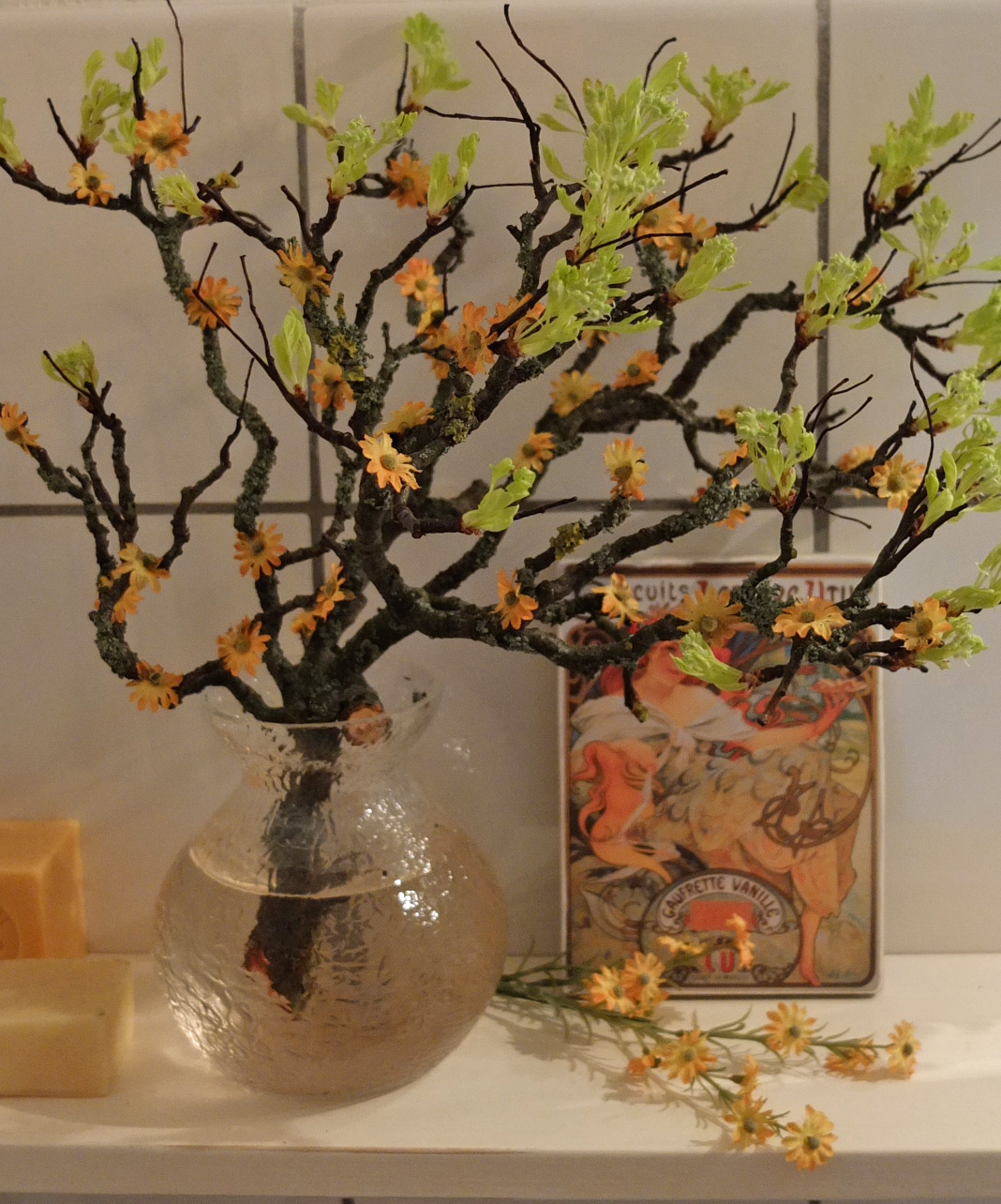 En sjov kroget gren fra en gammel tjørnehæk, som ikke er sprunget helt ud endnu har fået nogle små gule kunstige blomster limet på hist og pist som påskepynt på mit badeværelse