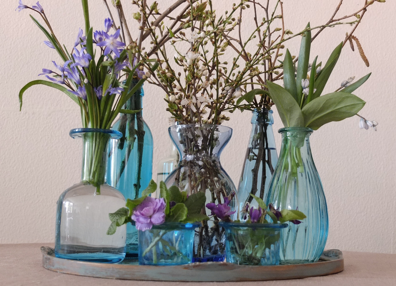 Smukt når solens stråler skinner gennem de blå flasker og glas med lidt grønt fra hundelufteturen og havens buske.