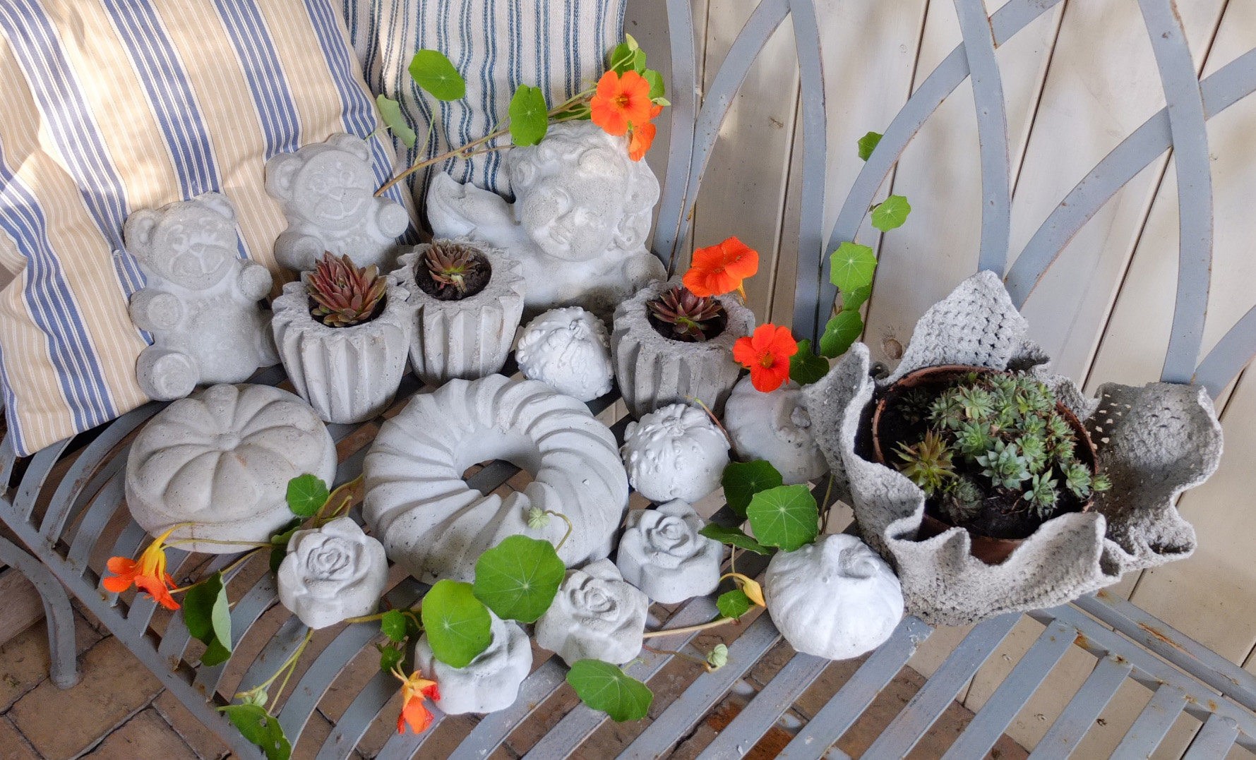 Her er lige et lille udpluk af hvad jeg fik støbt sidste søndag, jeg har brugt diverse små plastik forme, kageforme og latex forme, som jeg har lavet over pynte græskar. Urtepotterne er støbt i nogle tynde urtepotteskjulere og så med et engangsbæger med grus i midten. Det er nemt at fjerne, når betonen er tør. De forskellige forme er penslet med madolie lidt ligesom når man skal bage kager. Den sidste urtepotte skjuler er en gammel hæklet serviet, som er dyppet i beton og lagt til tørre over urtepotte.