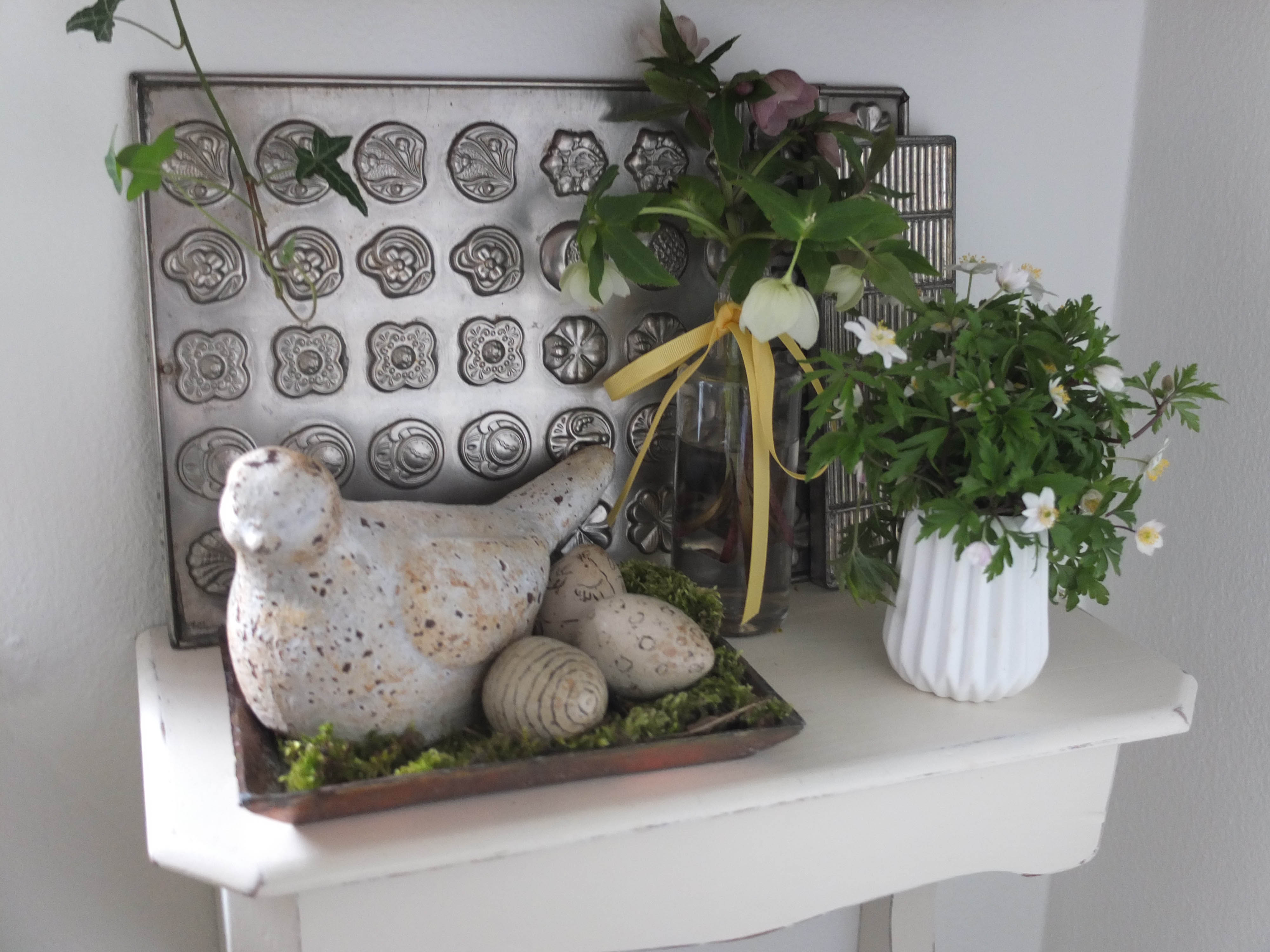 Keramik hønen fandt jeg i den skønne butik Wonder Who på Nørreport i Aarhus. Æggene har forskellige mønstre og er stentøj, lavet af en af vores dygtige lokale kunstnere, Ruth Nissen, som har værksted og galleri her i Højbjerg.