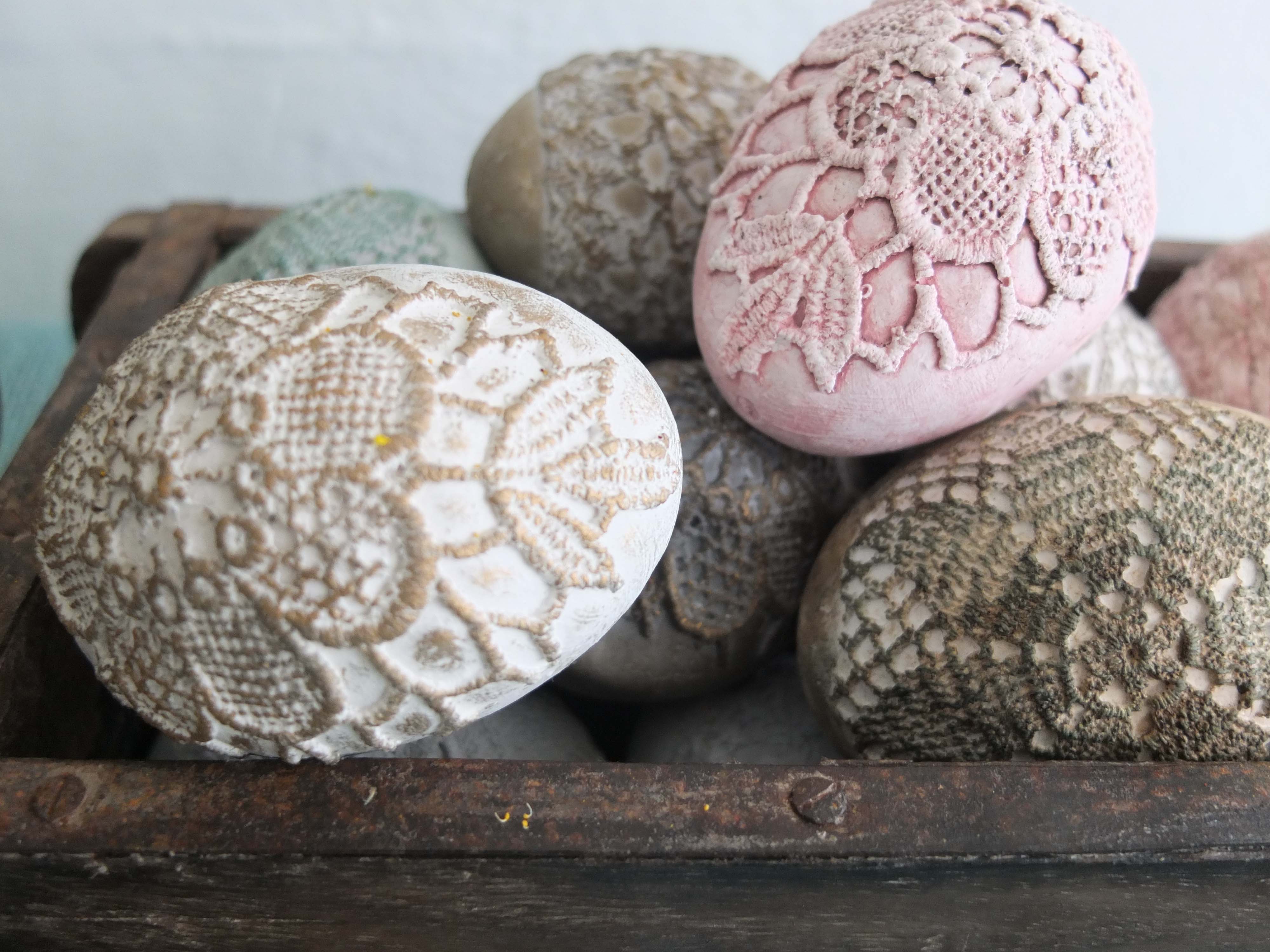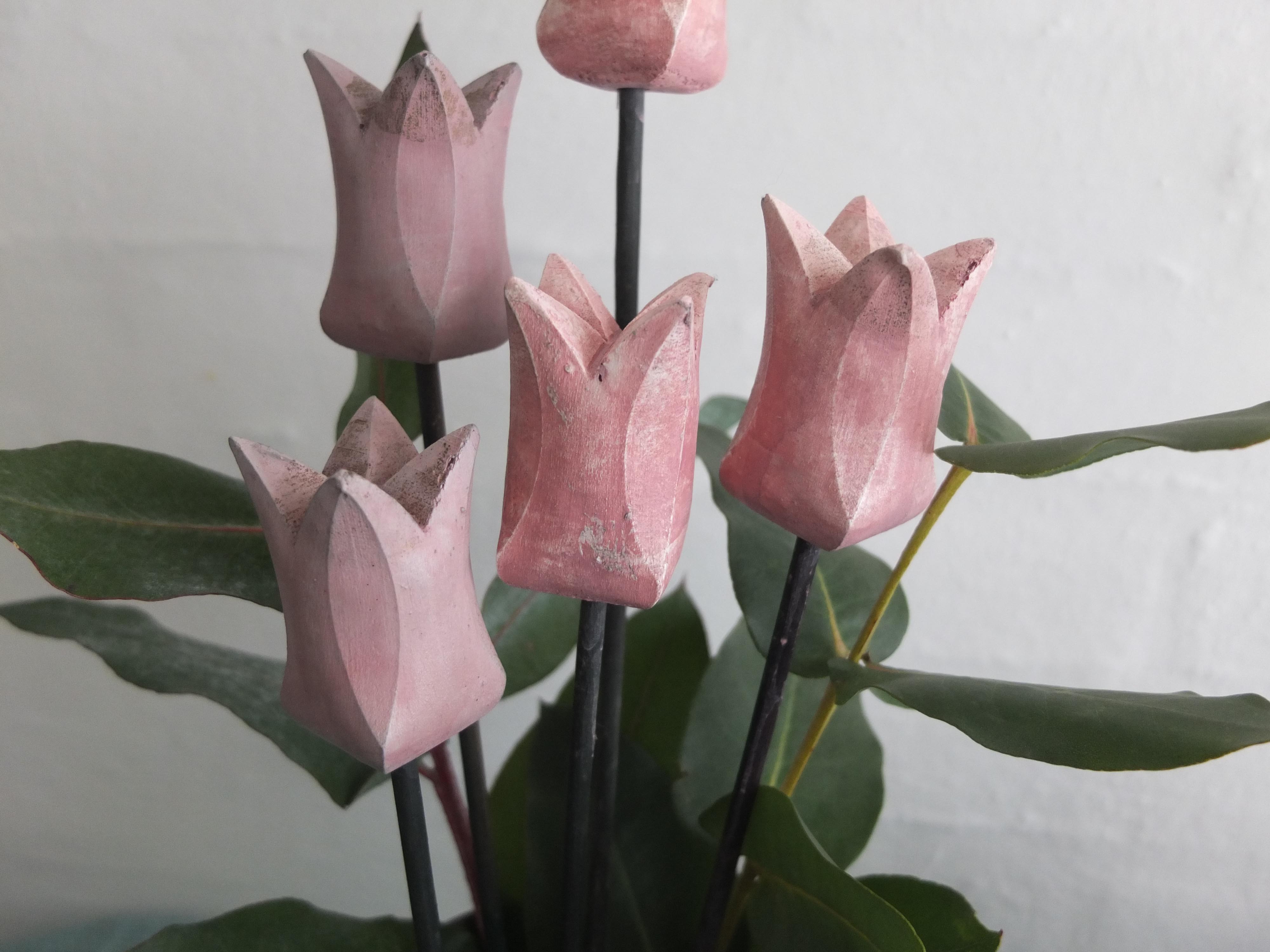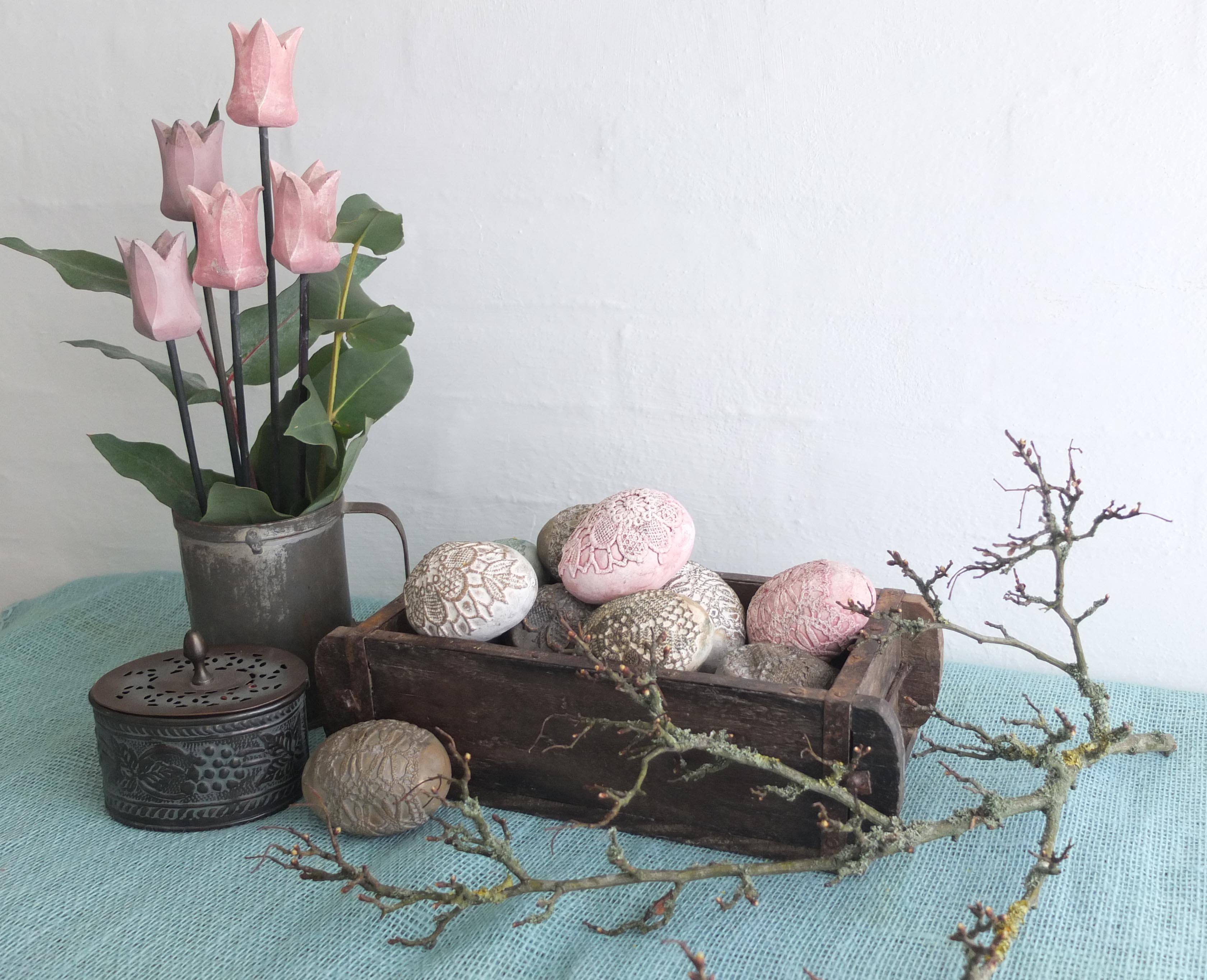 Påskeæggene og tulipanerne skulle egentlig være støbt i beton, men der var alt for koldt ude i mit havehus til at støbe den dag, så disse er støbt indendøre i model gips og har fået et tyndt lag kalkmaling.