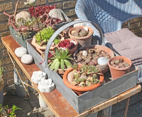 Sidste år fik jeg en stor zinkkurv af min veninde Anette i fødselsdagsgave. Den blev fyldt med vand, glaskugler og keramikænder. Men i år skulle den have ny anvendelse og hvad var ikke mere nærliggende end anvende den til nogle af mine ynglings planter, husløg. Er der noget skønnere end gamle rødlers urtepotter med forskellige husløg. De er også så nemme at passe, ikke at forglemme.