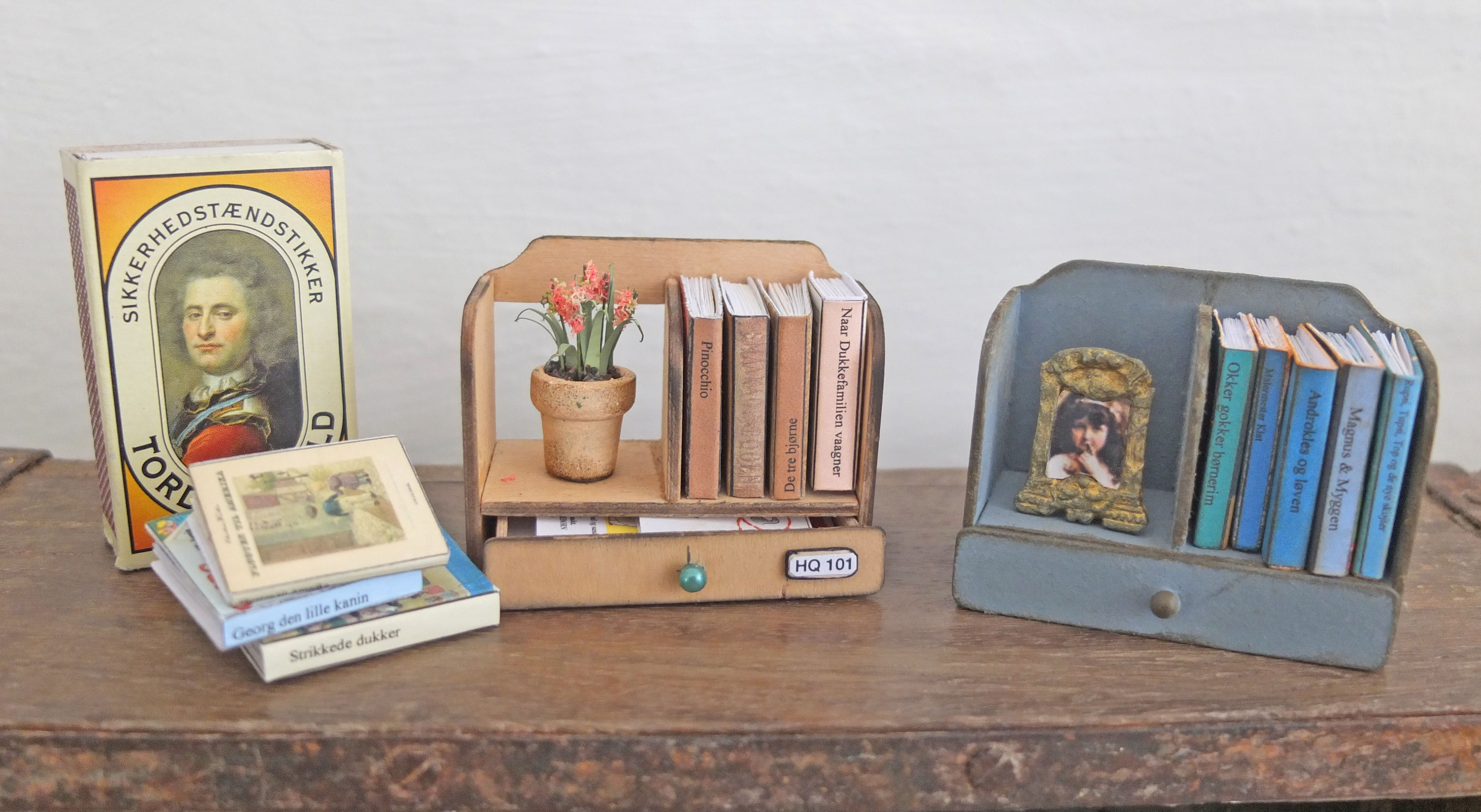 Et par små nemme bogreoler, som jeg fandt inspiration til på Printerest. Den lyse er lavet i 1,5 og 2 mm krydsfiner. Den blå er lavet af 1,5 mm MDF-plade og malet med kalkmaling. Alle børnebøgerne er kit fra Laura, som jeg har samlet.