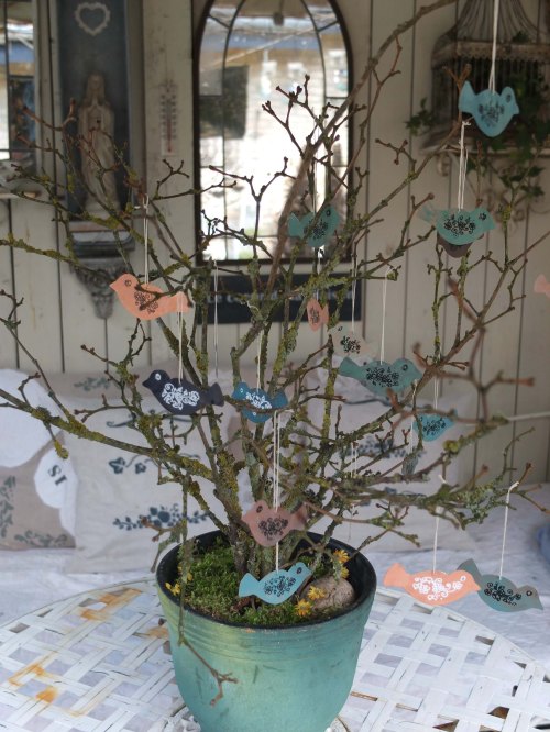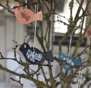 Disse små kobberfugle har jeg klippet ud af en kobberplade, malet dem med neglelak og derefter dekoreret dem med mine håndmalede blomster.