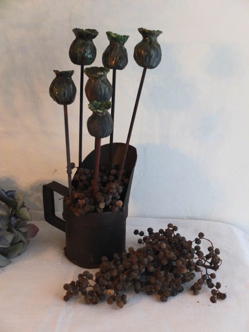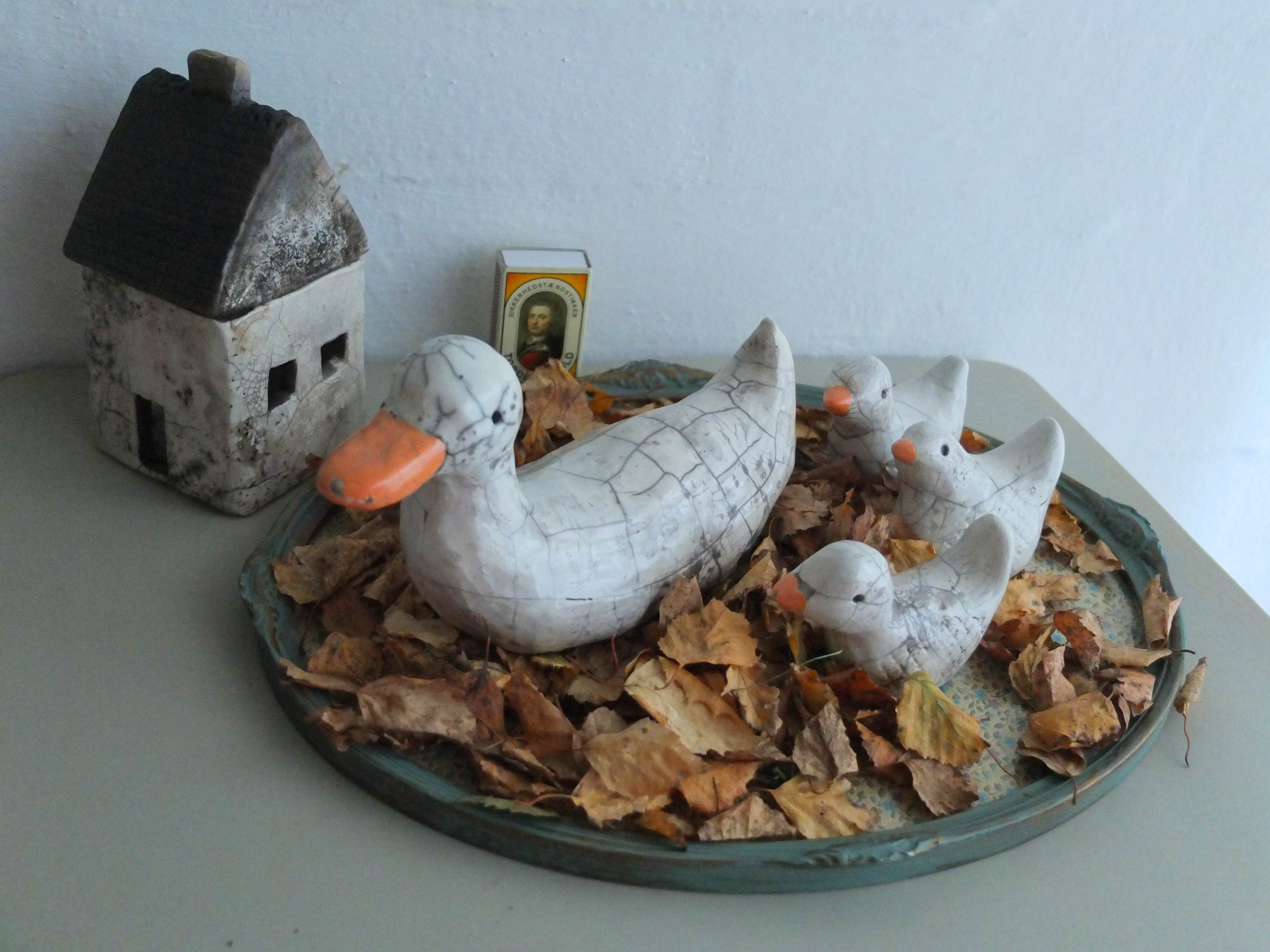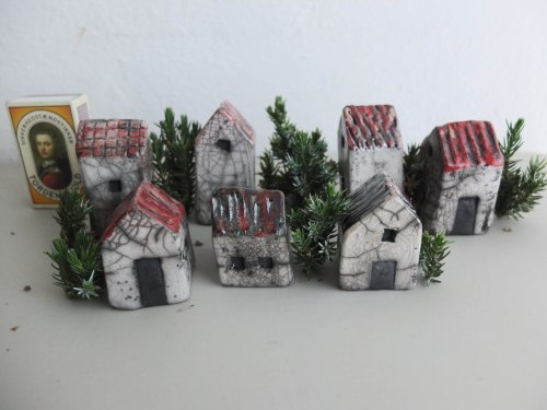 En flok små skæve huse, en andemor med sine ællinger samt nogle valmue frøkapsler var nogle af de ting jeg fik lavet på Raku kurset. Det er altid spændende den dag man brænder tingene i den store olietønde og derefter ruller dem i savsmuld, og så se hvordan krakeleringen tager sig ud. Det er absolut ikke sidste gang jeg vil prøve kræfter med raku teknikkerne.