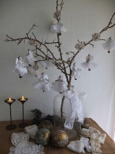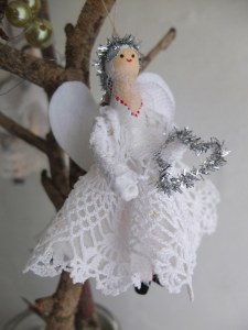 Ja så er der igen små engle på spil. Altså dem, der er lavet over gammeldags tøjklemmer. Disse har fået arme af piberensere, som er omviklet med stof/blonder. Skørterne er gamle flakoner eller mellemlægsservietter. Dejligt at de kan genbruges til noget. Tænk alt det fine håndarbejde, som man fik lavet inden FB og andre medier overtog ens tid. Disse små engle koster stadig 30 kr. pr. stk.