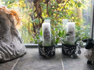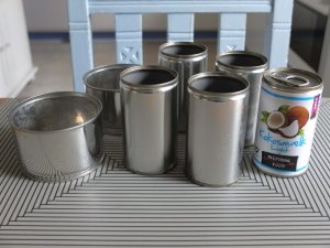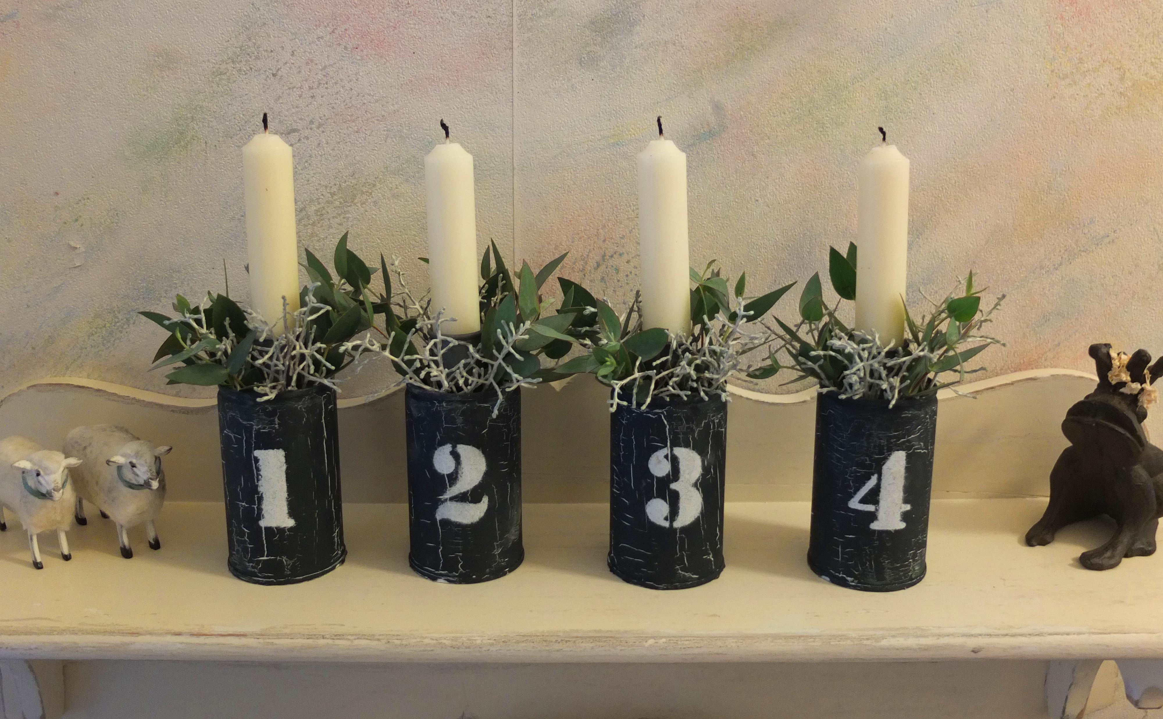 Disse har indeholdt kokosmælk. Jeg har vasket og malet dem, for derefter at dekorere dem med tal og adventslys. Der er anvendt oasis, eukalyptus blade og små kviste fra vindhekse eller hvad de nu hedder.