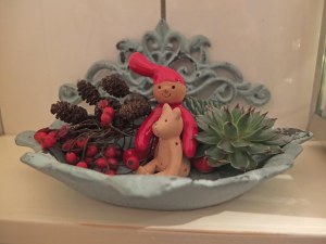 Det skulle egentlig bare være en gammel sæbeskål til fyrfadslys på badeværelset, men så kom den lille Pixi nisse frem. Hvad gør man lige med sådan en sød lille fyr, man kan da ikke bare putte ham ned i kassen igen nu det er jul, så lidt ellekogler, mariebær og et husløg i den fine sæbeskål, som jeg lige har købt i Wonder Who i Aarhus. Det kan da ikke gøres hurtigere.