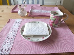 Kikker man lidt dybere i skufferne, finder man måske nogle duge, som man ikke har brugt længe, måske fordi de ikke passer i størrelsen mere. Jeg fandt denne skønne bolsjestribede, som egentlig også er noget lækkert stof. Den er blevet for lille til mit spisebord, da jeg altid har plader i, nu jeg klipper og syer så meget. Så tid til om forandring, der kunne blive en lille dug til sofabordet eller mit lille køkkenbord og endvidere seks dækkeservietter, som nu har fået lidt pynt af et stykke mellemværk fra mormors gemmer. Og det passer jo fint til mine engelske krus med blomsterne.