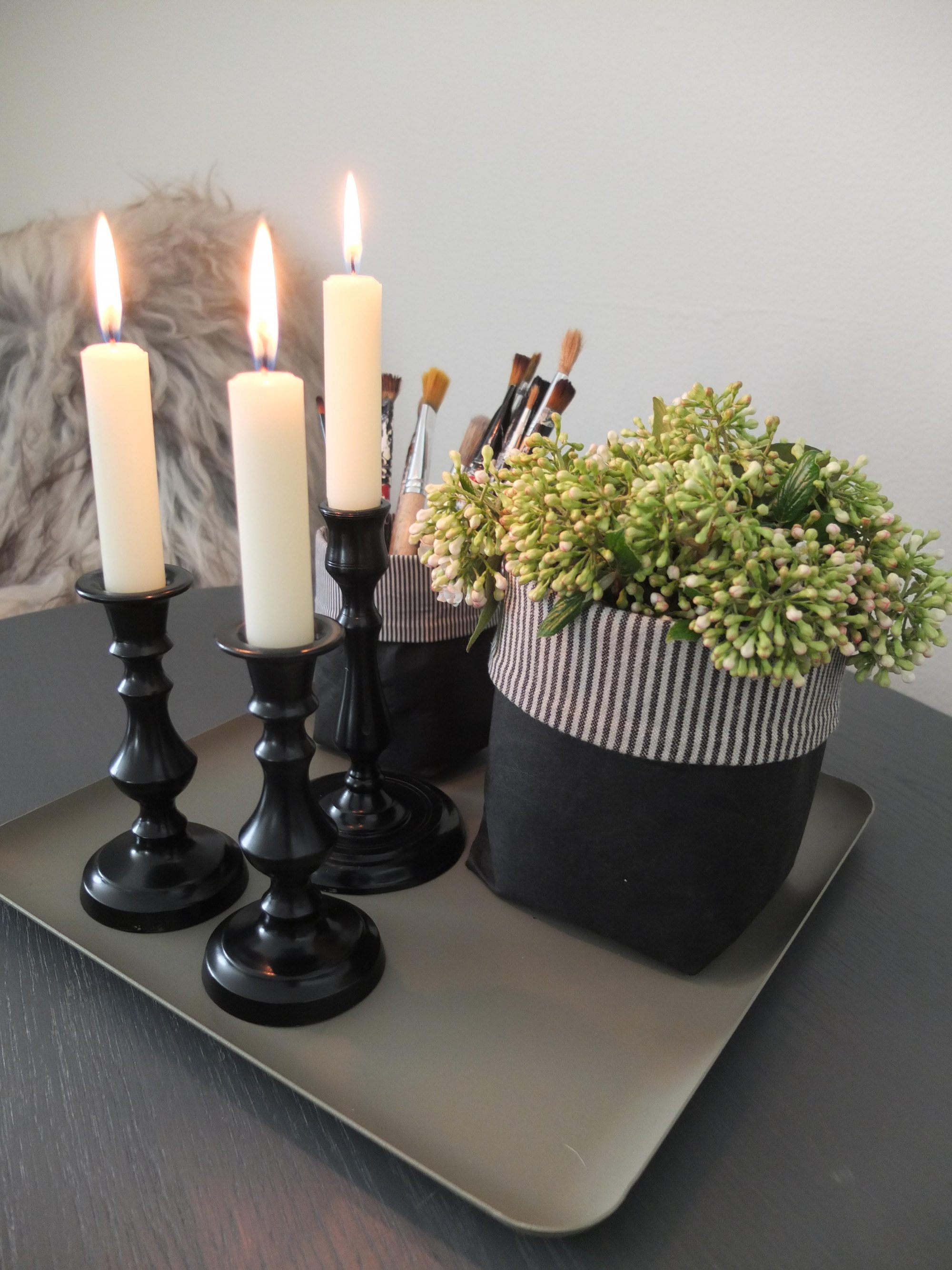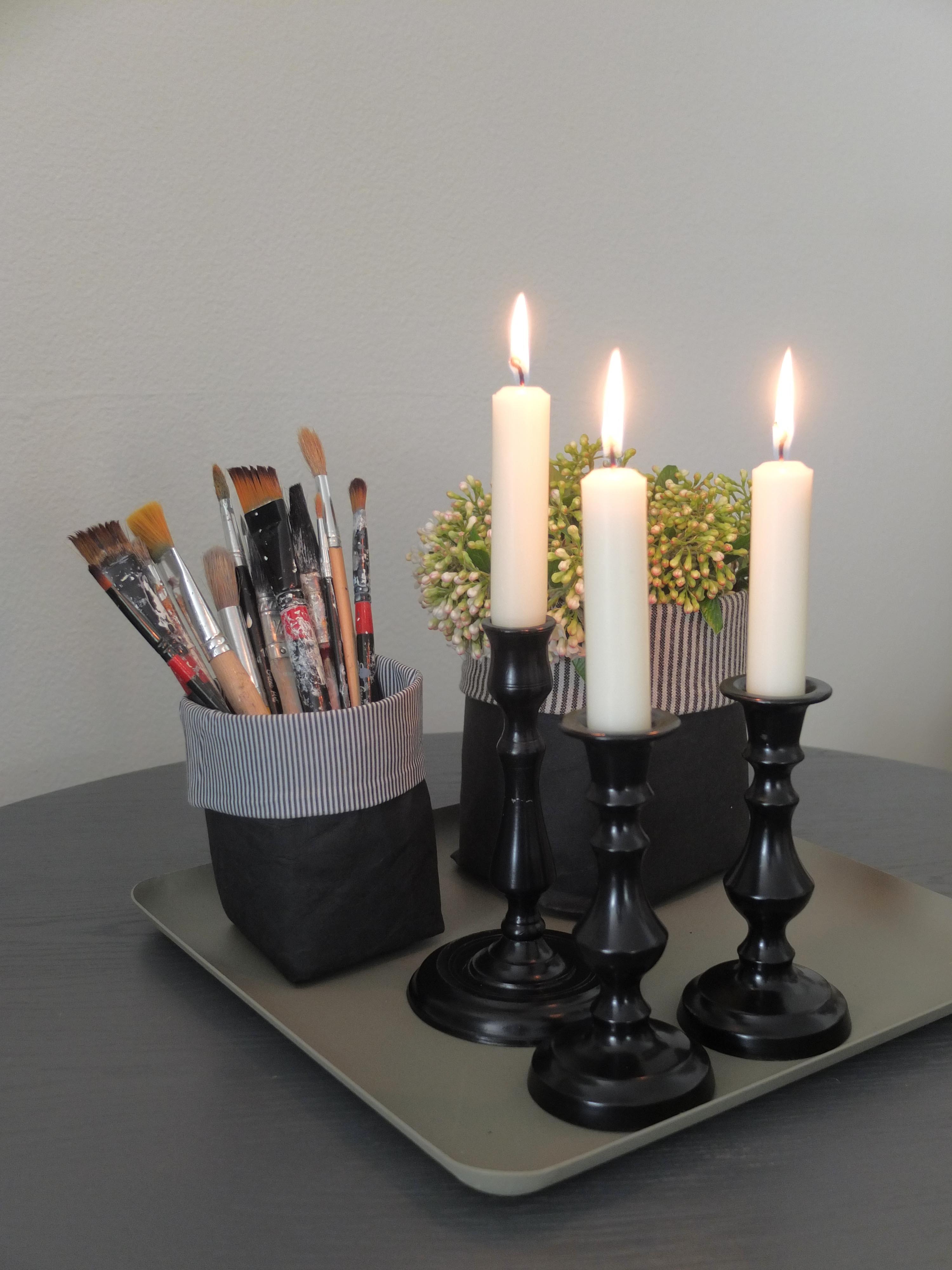 Gamle grimme ridsede tin lysestager har fået en gang sort spraymaling (skulle egentlig have været lidt mat sorte, men?) Beholderne er et kapitel for sig, de er lavet af genbrugspapir (ikke mig), som er købt. Det hedder noget så sjovt som “vegansk læder”. Det skulle få en krøllet effekt, når det bliver vasket. Man kan sy i det osv. Det er lidt stift som læder. Jeg har syet urtepotte skjulere og mindre beholdere til pensler, kuglepenne el. lign. Skriv hvis du vil købe et par stykker. 50 kr. pr. stk.