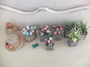 De små firkantede urtepotter er lavet af 1 mm MDF-plade og malet med kalkmaling. De små grønne planter er bare plastik. man kan jo købe så meget af den slags, hvis man ikke selv lige orker at fremstille det rigtig grønne papir og klippe stilke og lange blade. Roserne er lavet af 3 mm satinbånd, da jeg er udgået for 2 mm silkebånd. Men egentlig ret dekorative på deres egen måde.