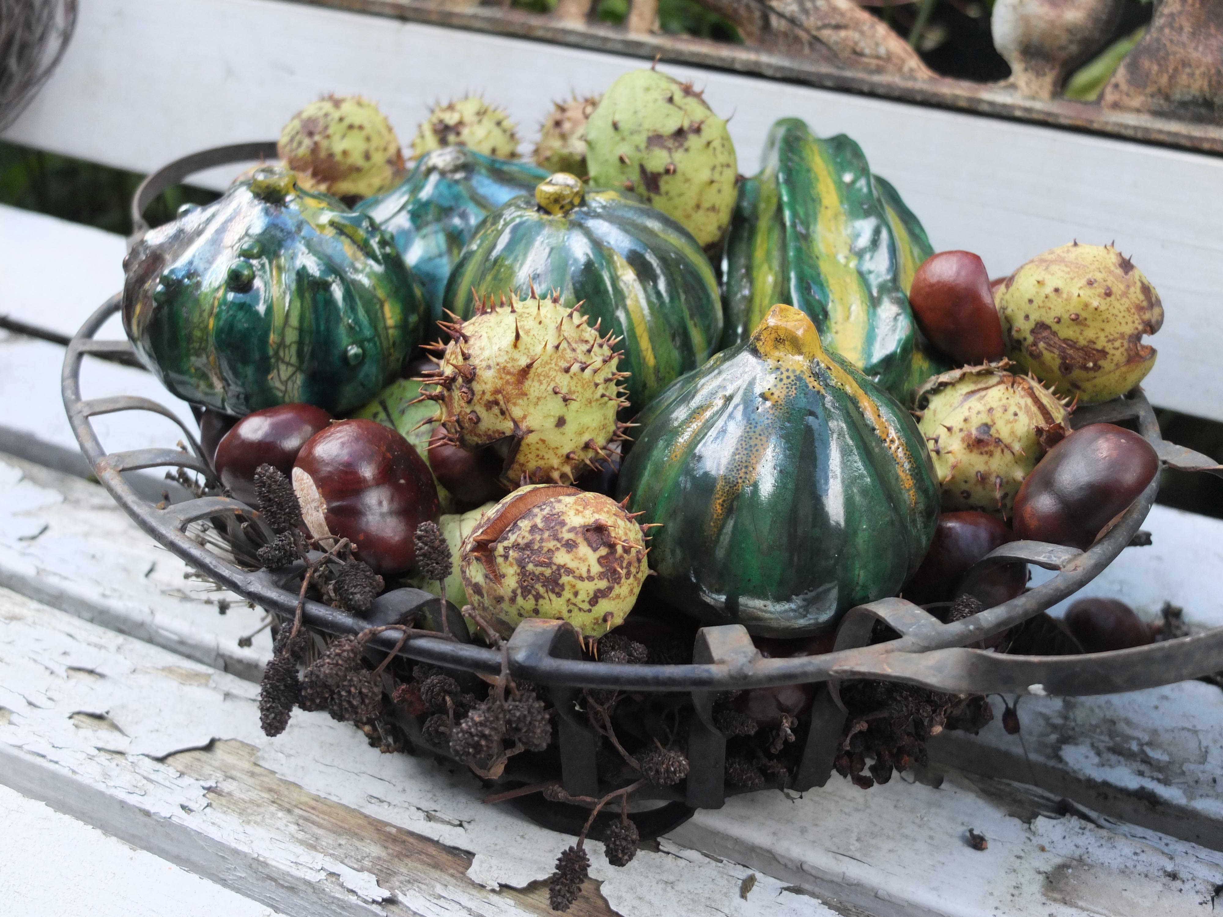 I år har jeg forsøgt mig med at lave pyntegræskar i Raku, farverne er måske nok lidt hidsige, men det var nu dem, der var i grønne og gule farver. Jeg har dog prøvet at tilsætte lidt sort, da jeg så den første komme ud af brændingen, så lidt ok derefter.