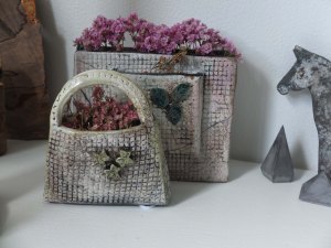 Disse to er de sørgelige rester af min taskefabrikation i Raku, så nu må de anvendes til vaser. Jeg havde faktisk lavet en mere, men den sprang i en masse små stykker, da den skulle køles af i vandbadet. Den havde ellers overlevet begge brændinger og turen i savsmuldet, men jeg var nok lidt for hurtig med at komme den over i baljen med det kolde vand. De øvrige kursister blev derefter også forsigtige, så alle de lidt større ting blev afkølet stille og roligt på græsplænen, inden de kom i baljen med vand. Så lærte vi også det. Den bagerste figur på billedet havde egentlig hanke, men de røg inden første brænding, da afstivningen (en bog) skulle fjernes inden forbrændingen!