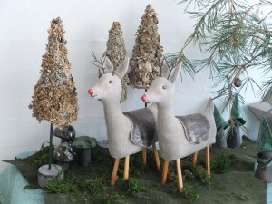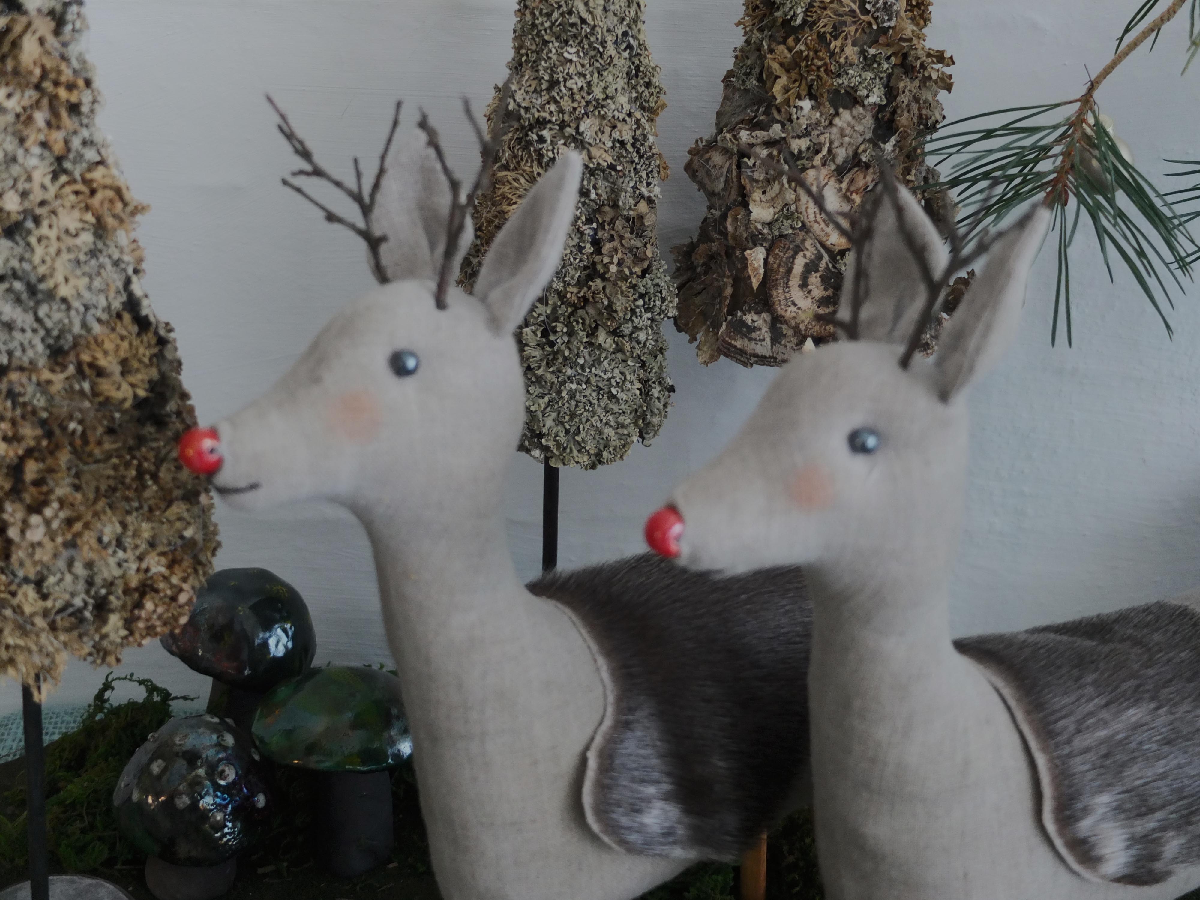 Et par glade rensdyr, syet i naturfarvet hør med dækken af sælskind. Benene er spisepinde og kan tages af, hvis man ønsker et liggende rensdyr. De er 28 cm høje og koster 100 kr. pr. stk.