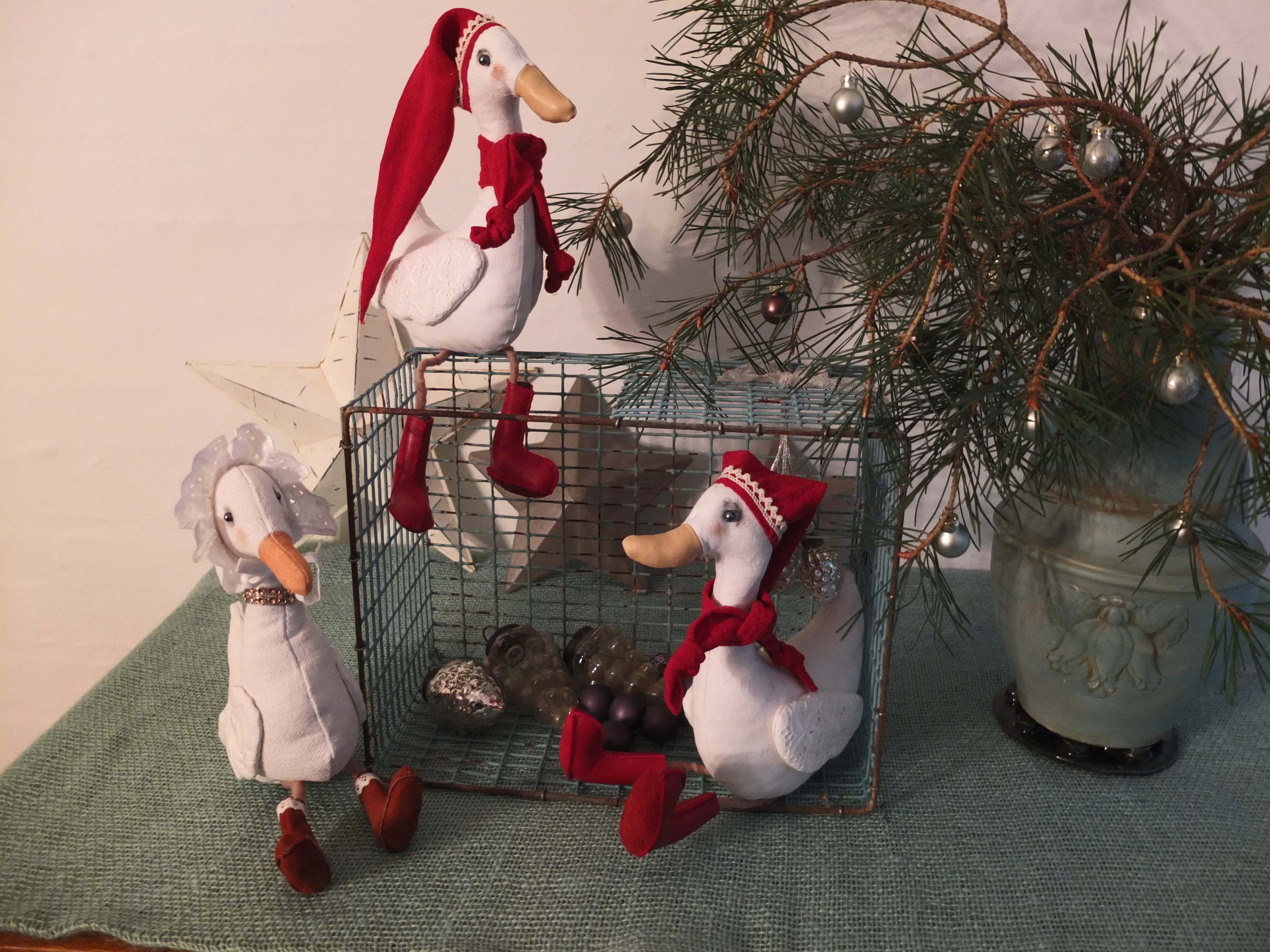 Nu har jeg fået syet endnu et par af de kære Rasmus and juledyr. De kan bøje både hoved og ben, fordi der er bøjelig ståltråd inden i kroppen. De er som meget andet syet af genbrugsmaterialer. De er til salg og koster 150 kr. pr. stk.