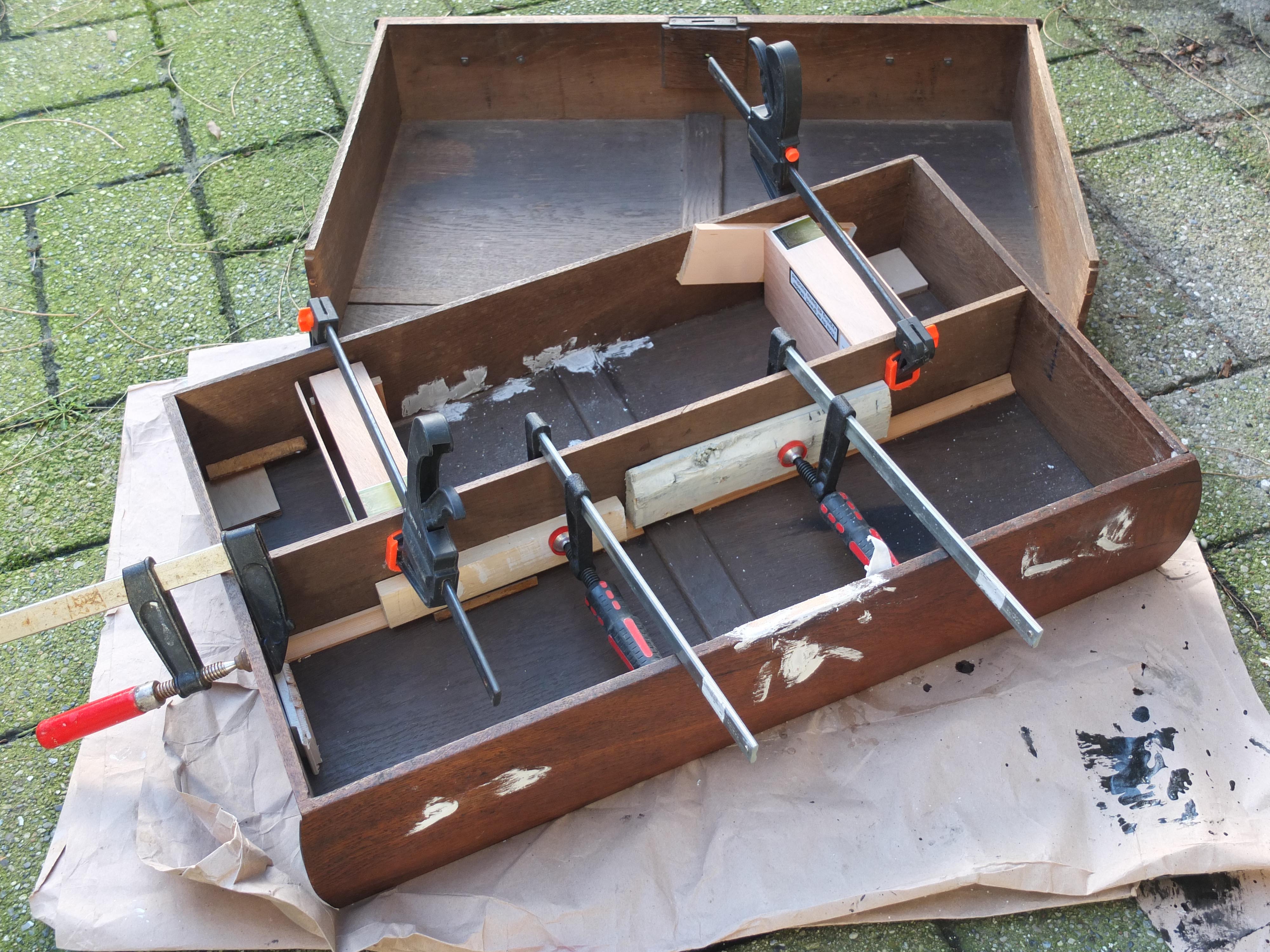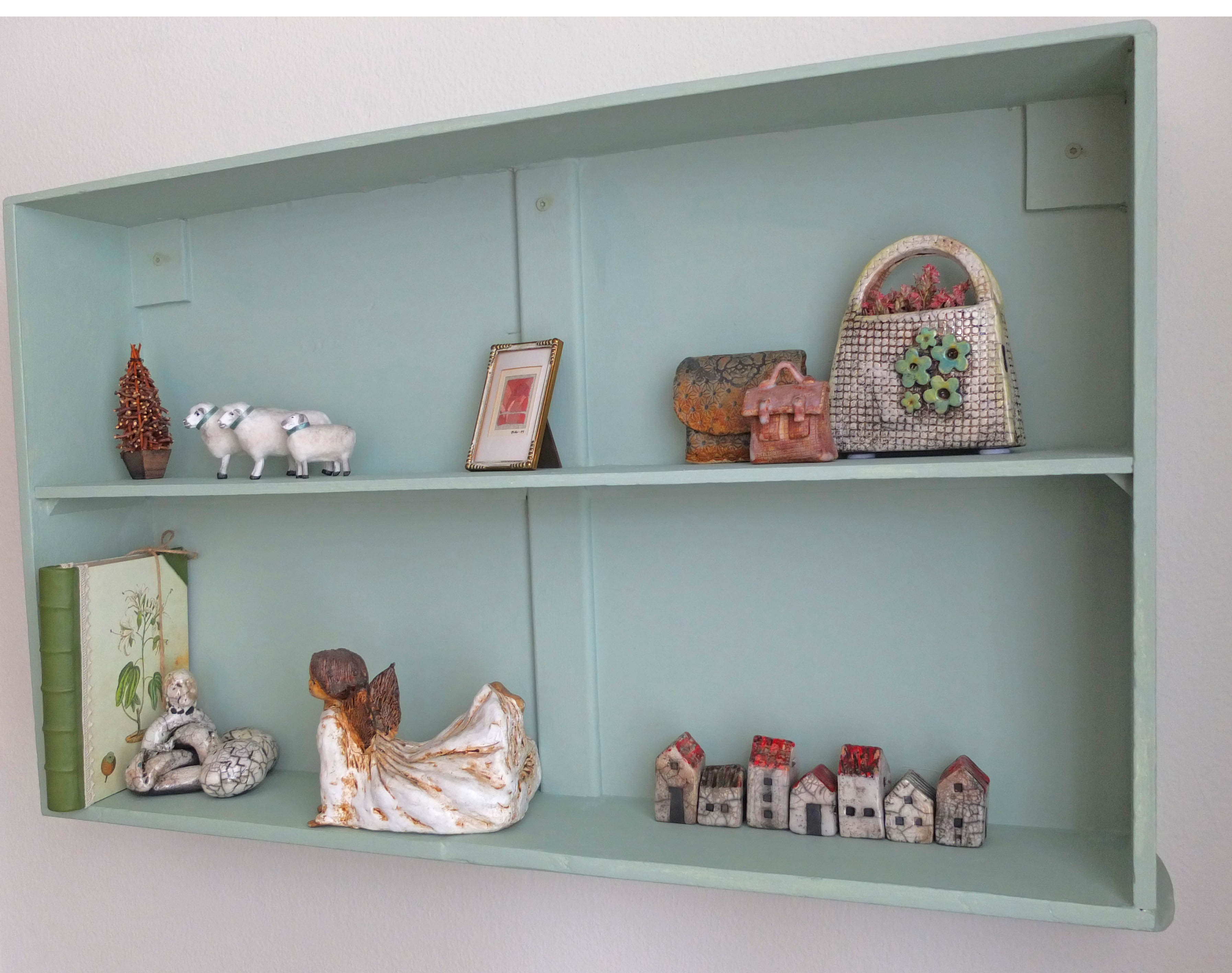 Igen lidt re-design: Et par gamle store skuffer fra et chatol, som min veninde Hanne skulle have skilt ad til div. genbrug. Den ene skuffe er der brugt det meste af, minus div. beslag. Den anden skuffe har jeg (indtil videre) kun brugt bagstykket af til hylde i min nye reol. Så er der limet et par klodser, både indvendig og udvendig i øverste hjørner til ophæng. Hylden er fået nogle trekant lister til støtte. Ja så kan Polyfilla og maling jo gøre meget. Og jeg har en fin reol til div. småting.