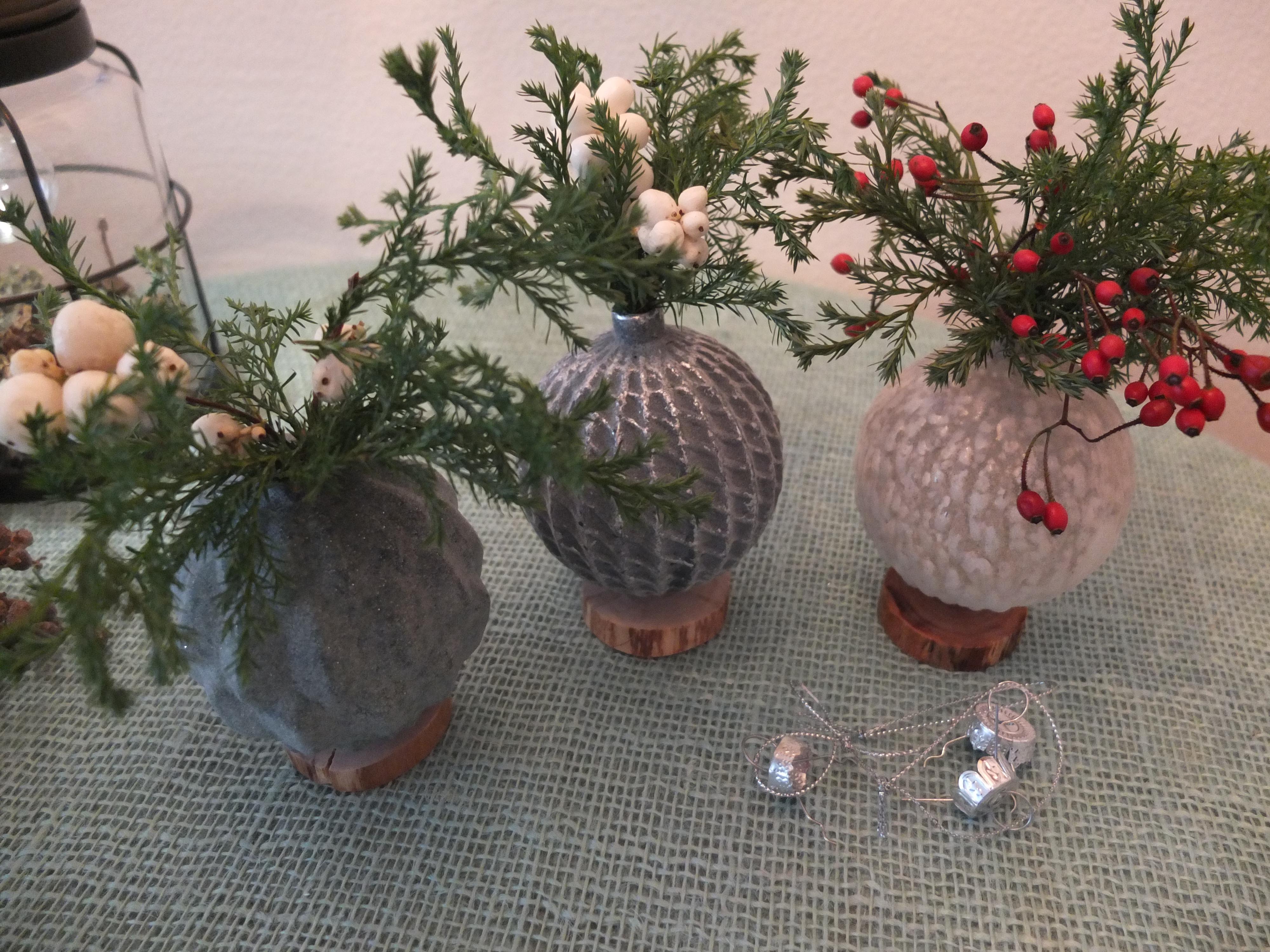 Ja hvorfor ikke, tag en julekugle, tag ophænget af og vend den på hovedet. Lim den fast på en lille træklods og vupti har man en sød lille vase til lidt enebær el.lign. nemmere eller hurtigere kan det da ikke gøres.