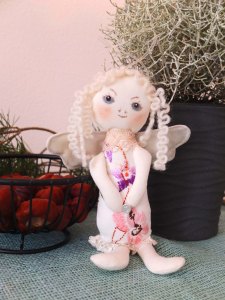 Denne engel er syet af stof fra en gammel broderet dug og blonder mv. er fundet enten på loppemarked eller i en genbrugsbutik. Synes det er så skønt, at noget af de fine gamle broderede duge kan genanvendes, selv om der er pletter på eller slidt huller et andet sted. Håret er garn der er trævlet op fra en gammel striktrøje. Hun kan købes for 100 kr.