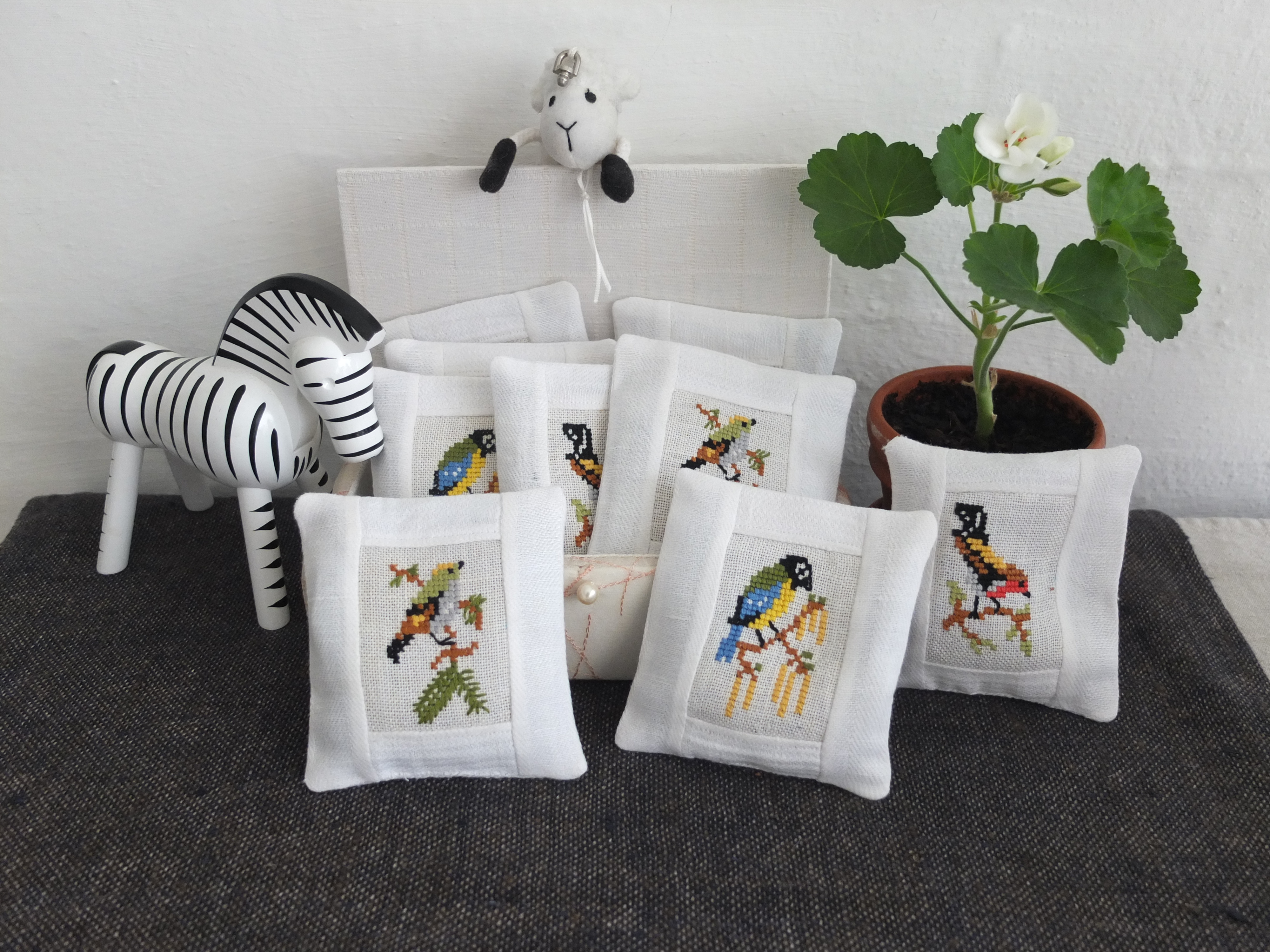 Jeg var så heldig at finde et fint broderet bakkebånd i en genbrugsbutik. De små søde fugle var lige til at klippe ud og bruge som mellemværk i de små poser, som jeg har syet af et stykke stof fra et gammel hør viskestykke. Poserne er så fyldt med lavendler, som jeg har fået af en veninde. Dejlig duft til sengetøj og håndklæder.