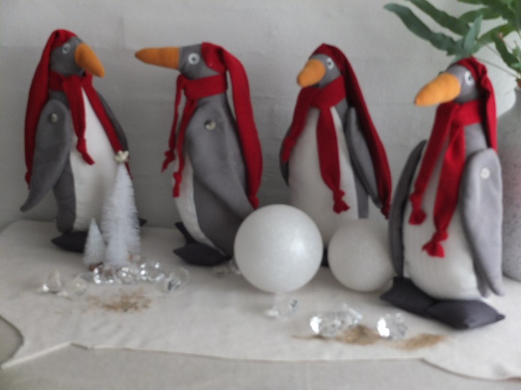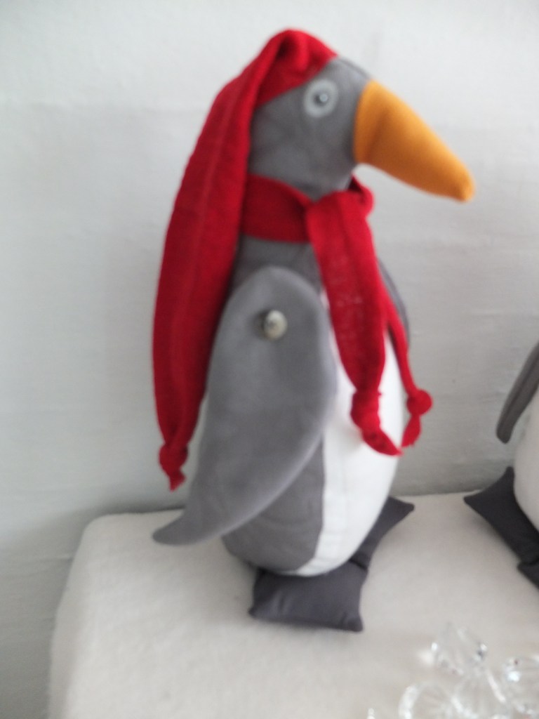 I år har jeg valgt at sy pingviner, når juleænderne var med i sidste års kollektion. Jeg så et par pingviner i en butik. De var dog i plastik og med lys i. Så hvorfor ikke designe mine egne i genbrugsstof. Det grå stof er fra en damask dug. Det hvide på brystet er fra gamle hør viskestykker og resten er div. stofrester. Der er en lille pose med sand inden i for neden, så pingvinen kan stå stabilt. De er ca. 33 cm høje og kan erhverves for 100 kr. pr. stk.