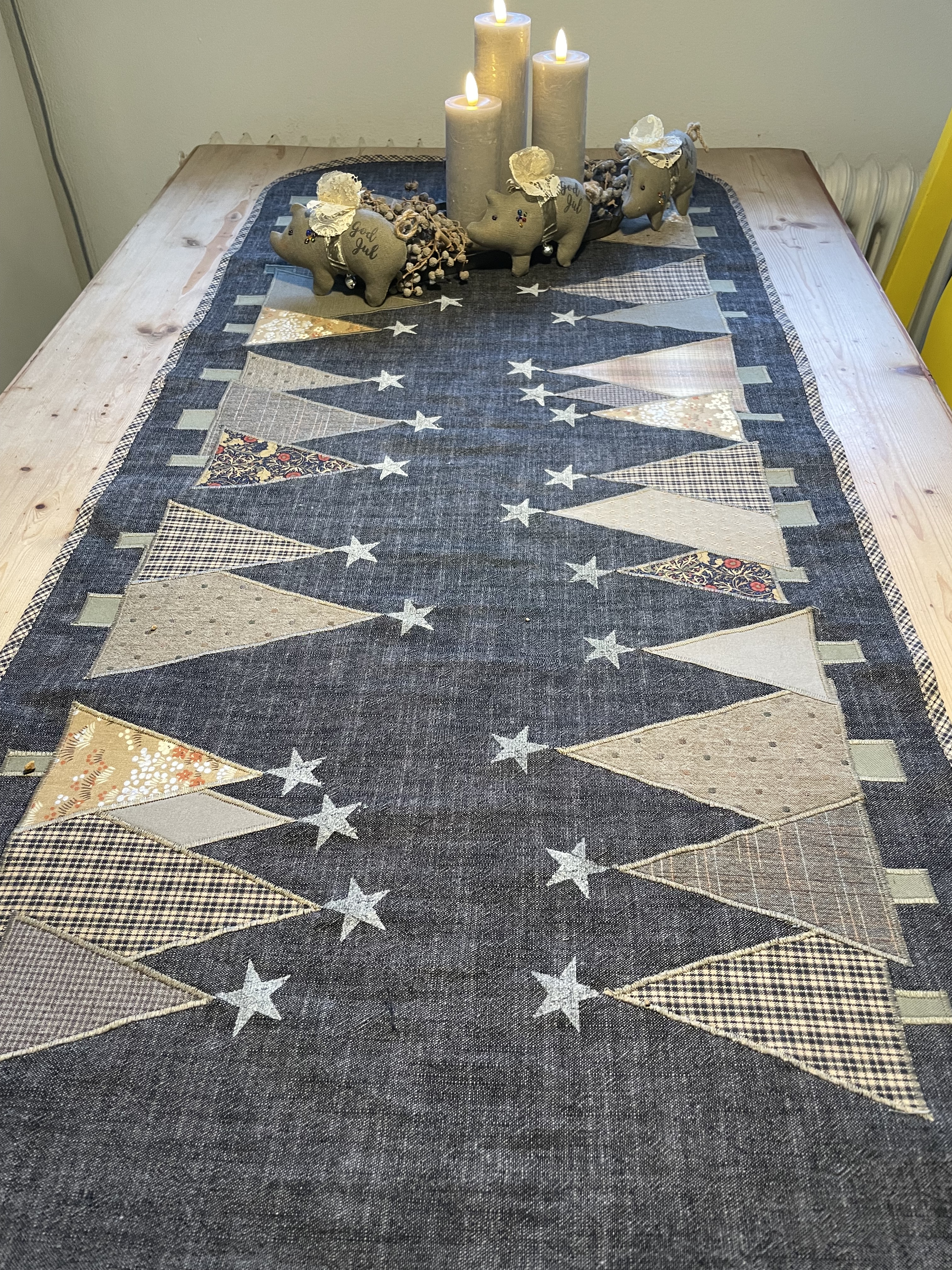Se dette års juleløber i natur farver med japanske patchwork stoffer som stilistiske juletræer på hørstof. 50 x 120 cm. De hvide stjerner er stoftryk. De små stofgrise med vinger og bånd er også til salg. Spørg efter pris, hvis det har interesse.