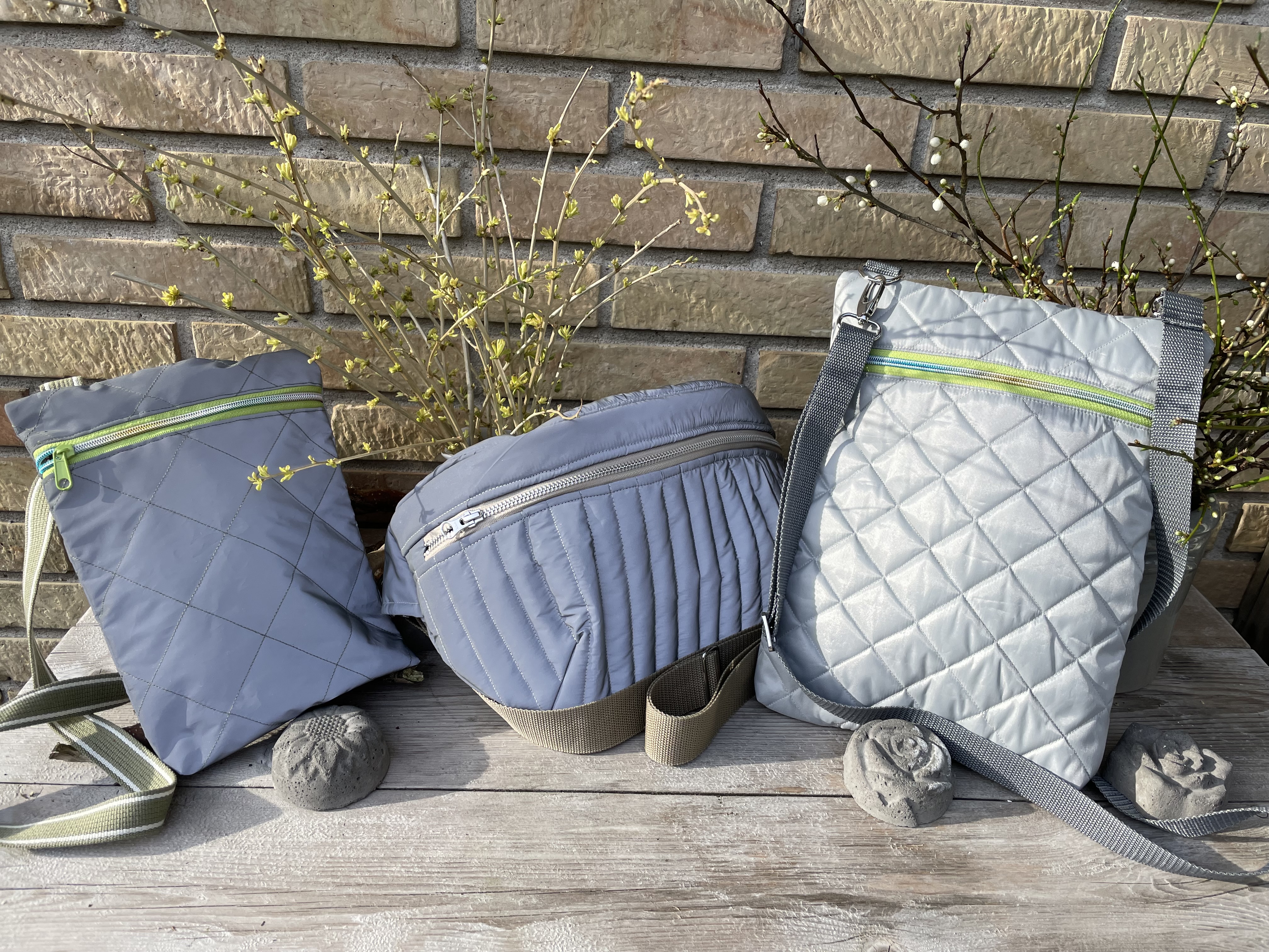 Disse tasker er syet af refleks-stof og quiltet med lidt fyld samt foer. Den store i midten måler 36×20 cm og koster 250 kr. Den næste til højre måler 32×24 cm og koster 200 kr. Den mindste til venstre måler 26×20 cm og koster 150 kr. De har alle skulder remme af gjord bånd 140 cm lange.