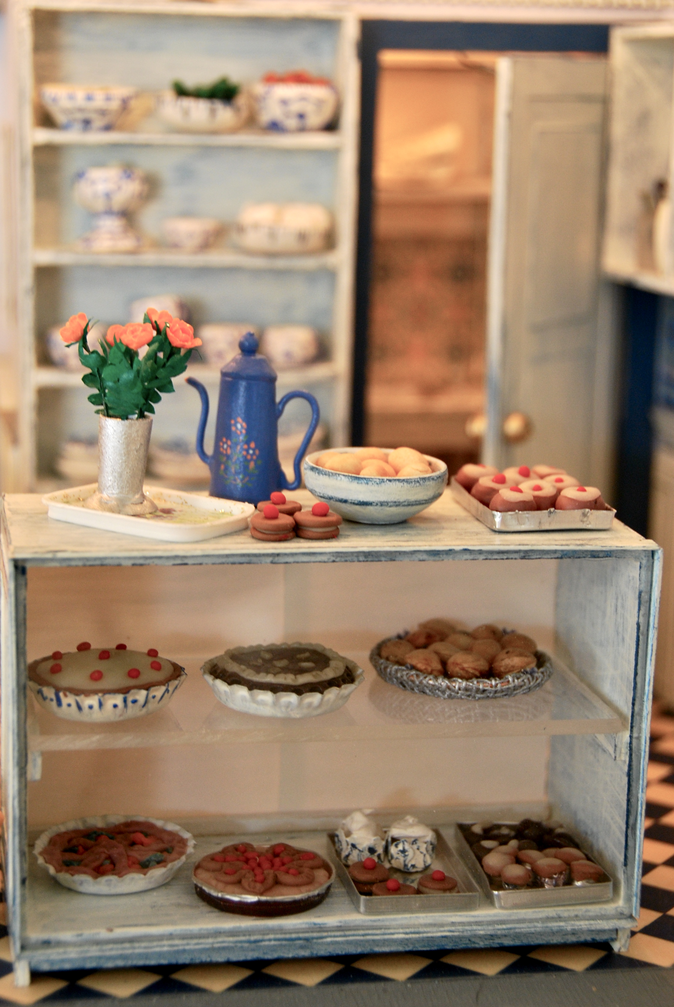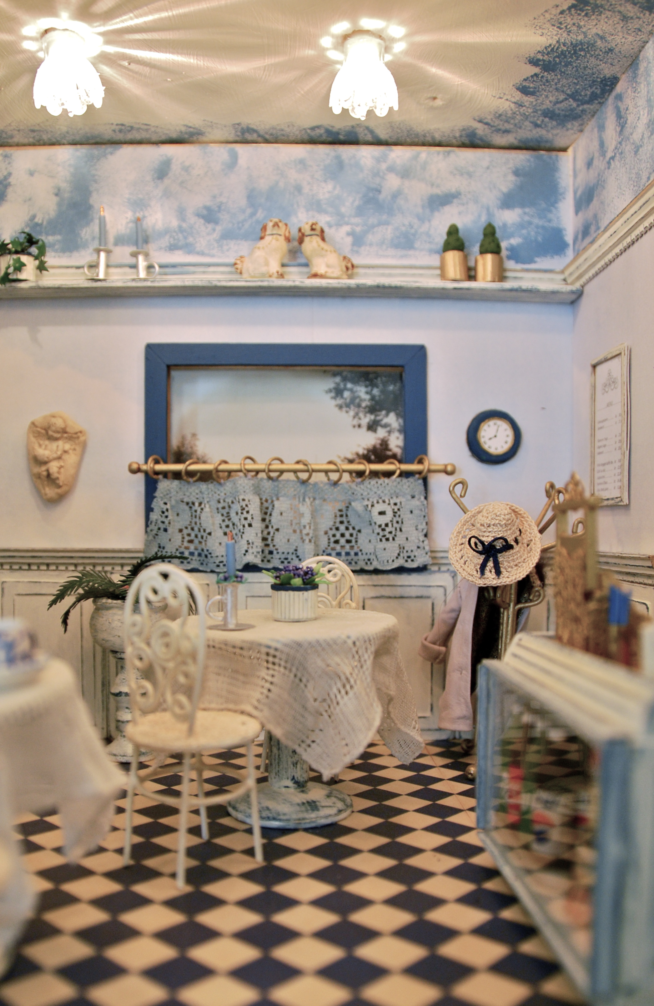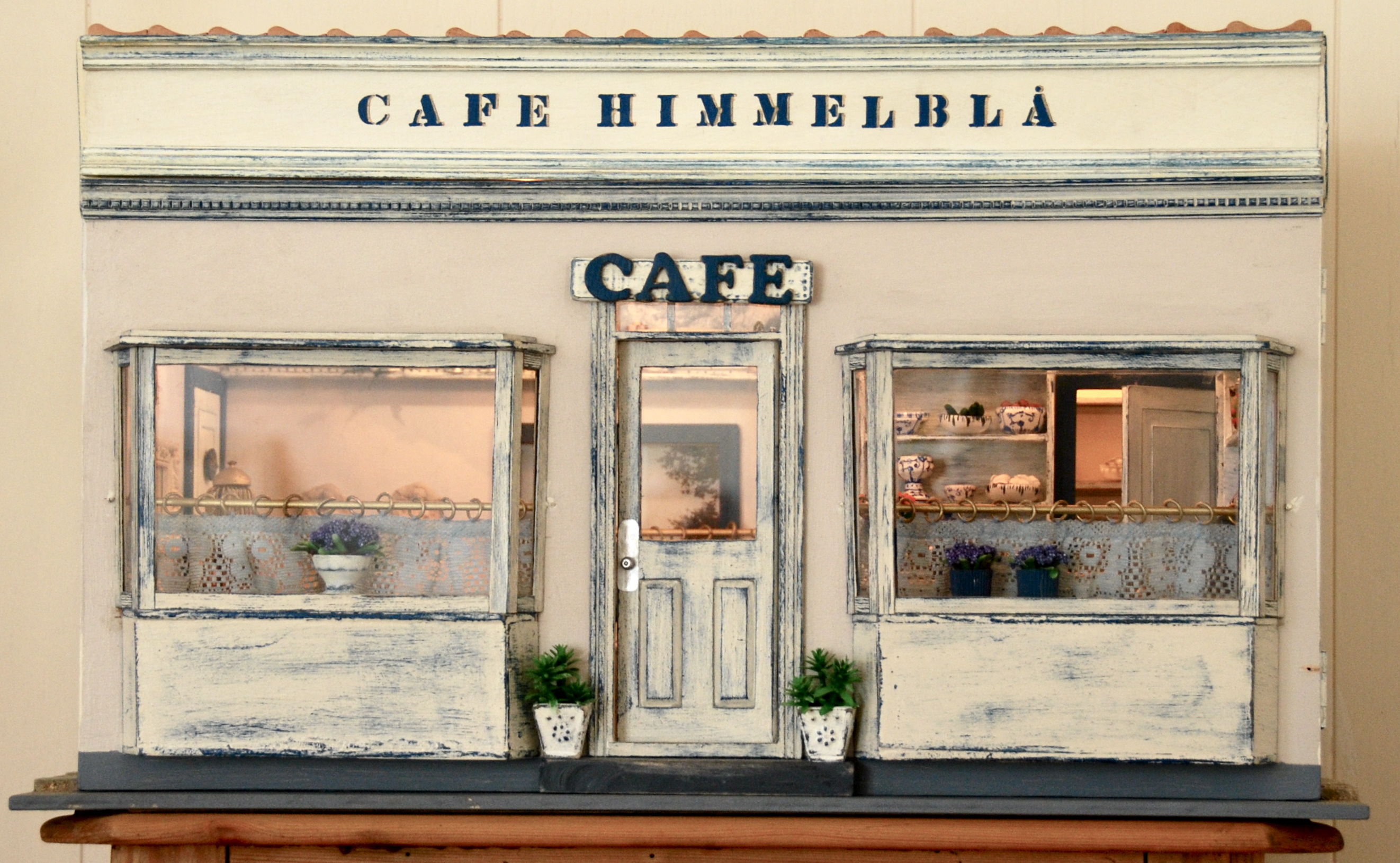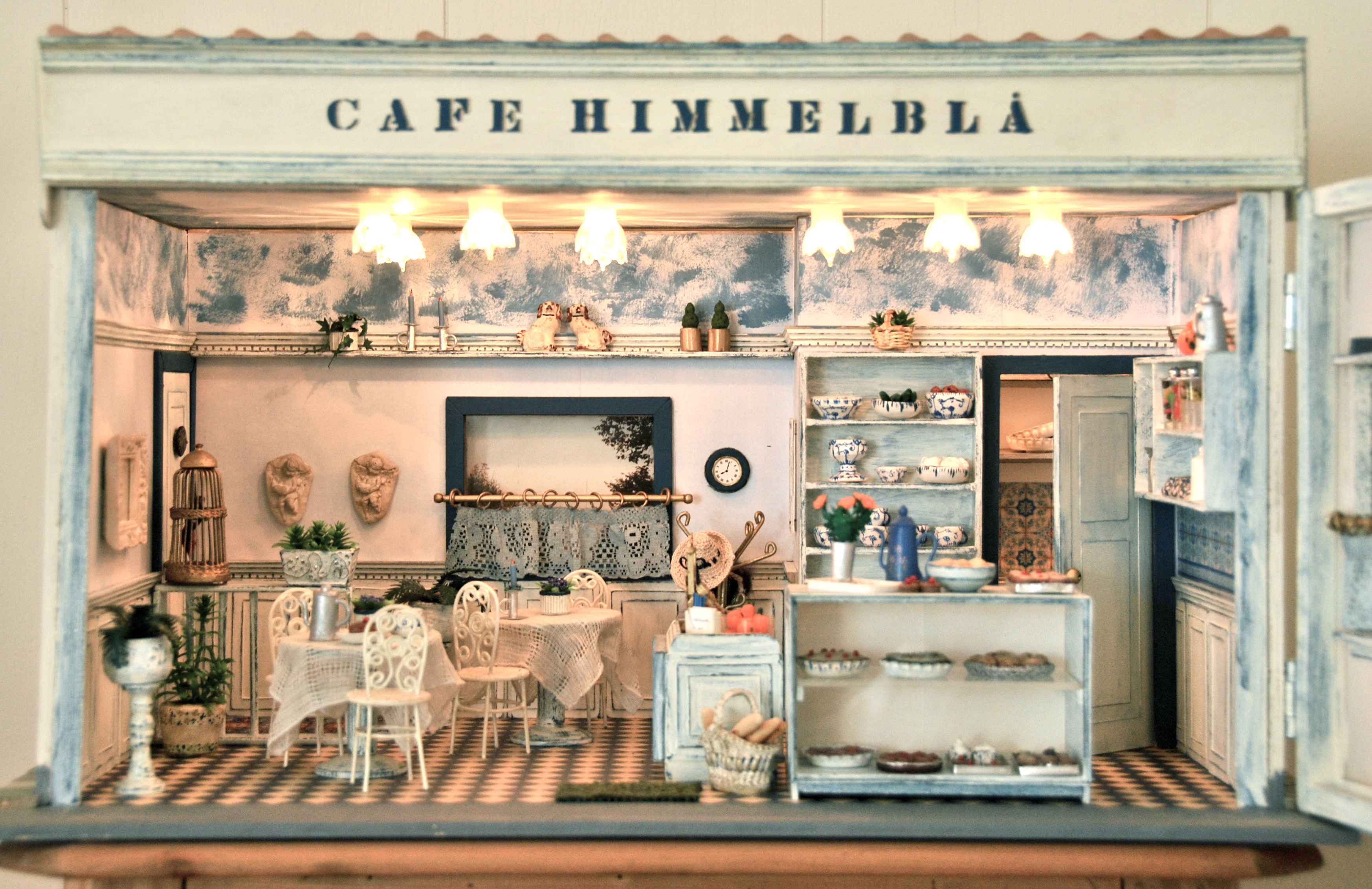 Fransk caféstil i miniatureudgave. Café Himmelblå er bygget i 1:12. Størstedelen af caféen er håndlavet og produceret af fimo, gibs, wire, andre hobby artikler og genbrugsmaterialer som: plastlåg, kapsler, stof og blonderester.