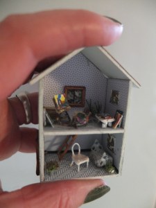 Denne lille pavillon har jeg lavet på dette års højskole kursus i miniature. Ideen så jeg på en udstilling i foråret i Risskov, hvor der var lavet forskellige pavilloner, men med samme tema, nemlig et porcelænslåg som tag. Så gik jagten ind på at finde et passende fint låg til projektet. Dette er fra et kartoffelfad, købt på et loppemarked. Top og bund er savet ud af 6mm krydsfiner. Siderne er udformet forskelligt, vinduerne er små stykker glas, som er indfældet i tynde trælister, savet ud af malerpinde. Blonderne i vinduerne er sat på med decopage lim. Skodderne er lavet af kaffepinde, som er limet forskudt ovenpå hinanden. Bagsiden af pavillonen er lavet af en dækkeserviet, en af dem med små bambuslister fra Tiger. Gulvet er laver af siderne på æggebakker, som er klippet ud i små firkanter på 15×15 mm, de er derefter malet, fået lidt sværte på kanterne, limet op på en tynd MDF plade, fået en gang krakeler lak, derefter en tynd gang kalkmaling og til sidst en gang klar vandbaseret, halvmat gulvlak. Mange af de små ting er gipsafstøbninger af div. små låg og dippedutter.