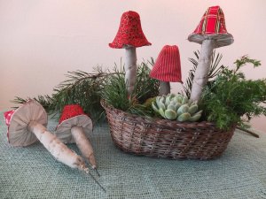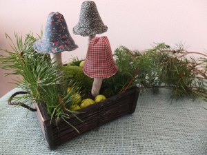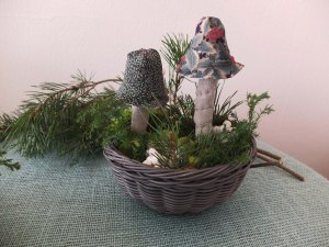 En ny ide, jeg har ikke set dem før. På messen “Kreative Dage” i Fredericia så jeg disse, synes jeg, skønne syede julesvampe. Jeg købte straks lidt stof og fik så mønsteret gratis med. Nu har jeg så syet nogle stykker og lavet lidt dekoration omkring dem, for at se hvordan de tager sig ud i den sammenhæng. Fint, men anderledes. Kan du ikke selv sy, så kan du købe et par stykker af mig. 25 kr. pr. stk.