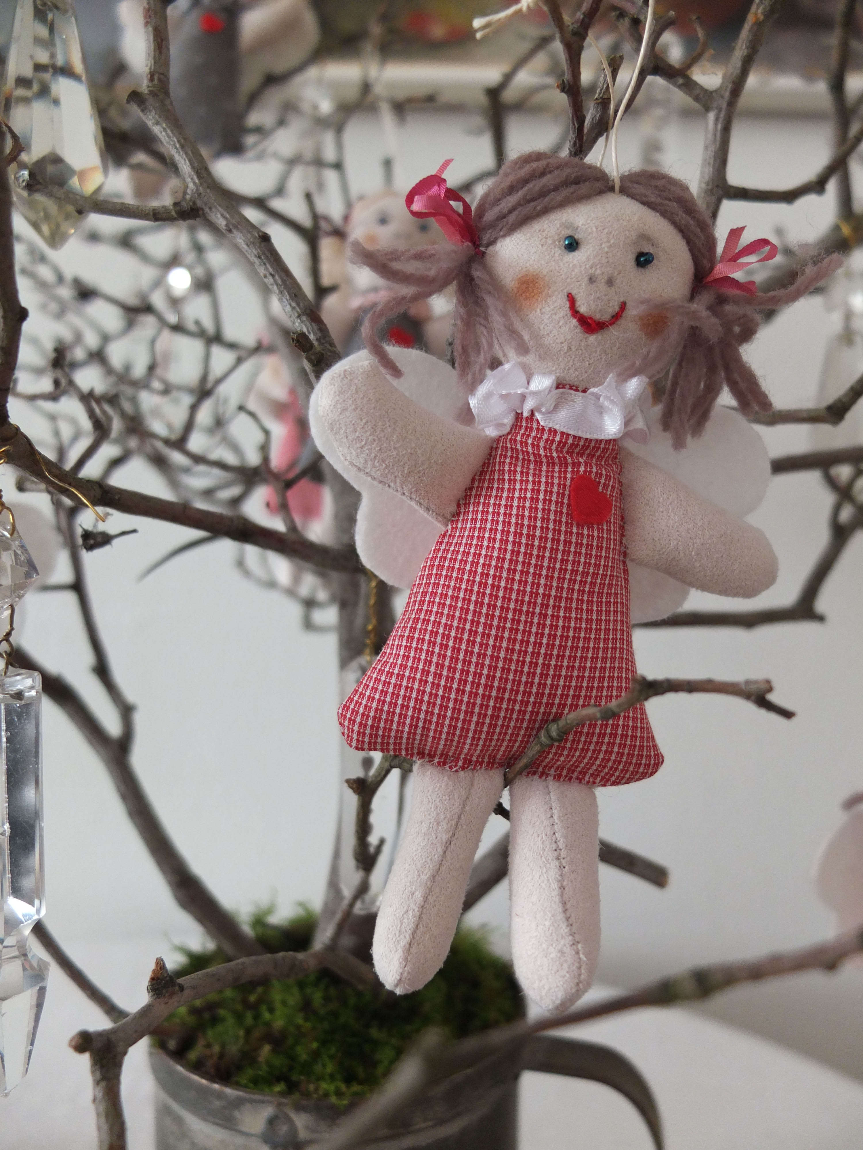 Julen nærmer sig og det er tid til så småt at pynte op derhjemme i stuen. Man kan jo starte med nogle smukke grene, det behøver jo ikke være gran eller fyr, som hurtig bliver så kedelig at se på. Jeg har siddet og hygget mig med at sy små engle af diverse stofrester. De er faktisk ret dekorative, når de bliver hængt op på de nøgne grene.