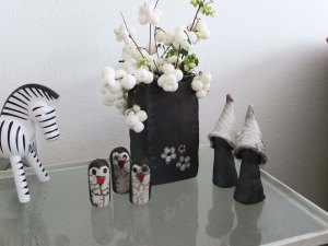 Ja den ser ikke ud af ret meget, men den er bare så fin med hvide blomster eller som her med grene med “snebolde”. Endvidere blev det til et par sorte trolde med æggeskalsfarvede huer og tre små ugler, troede jeg, at jeg havde lavet, men min datter påstår, det er pingviner, så vælg selv, kun fantasien sætter grænser eller hvad man nu siger.