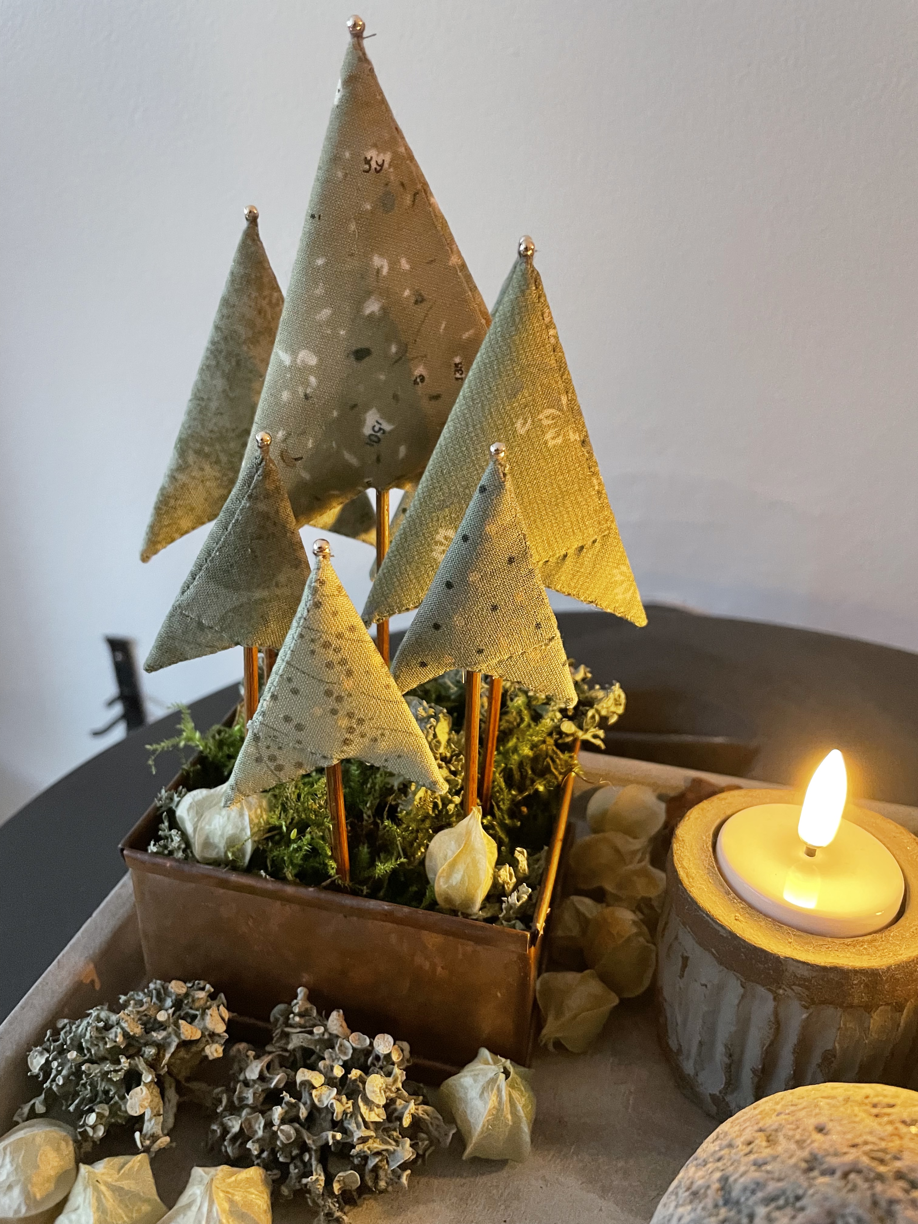 Disse små stof juletræer er en ide, som blev vist på “Kreative Dage” messen i Fredericia af patchwork folkene fra Butik Kastanja. De er rigtig nemme at lave, syet over to kvadratiske stykker pap, f.eks. 4×4 cm, beklædt med et tyndt stykke skumgummi eller lign. og derefter beklædes firkanterne med stof. To firkanter skubbes sammen, så det ligner et juletræ og håndsyes med små sting på begge sider og i bunden. Man kan male en spydpind brun med en tusch til stammen. Man kan også rulle et lille stykke brun stof og sy ind som stamme. Derefter lave et lille ophæng til en gren eller til juletræet som pynt.