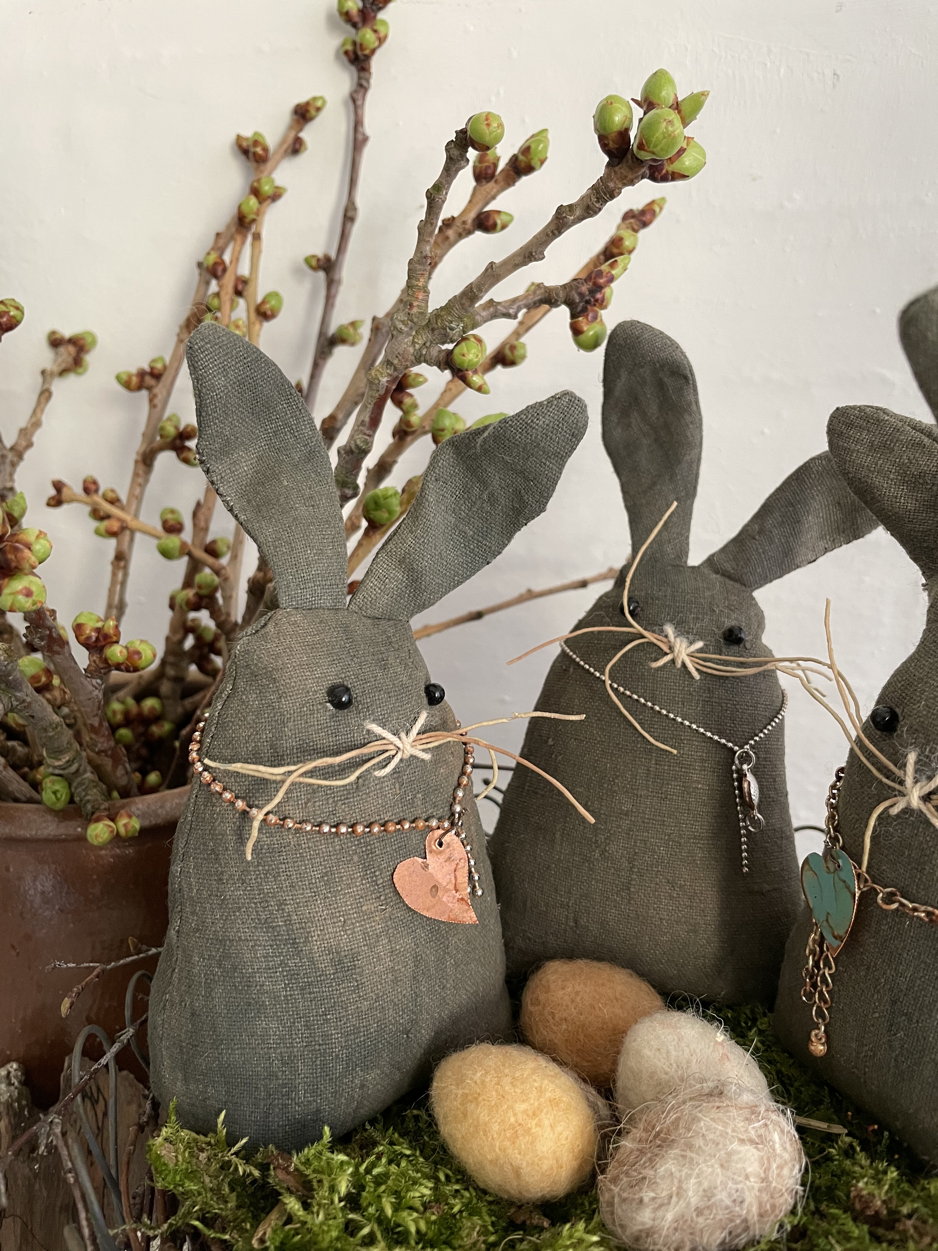 Da min ide med disse påskeharer er at de skal se gamle og slidte ud, så er stoffet først malet med kalkmaling og derefter fået flere lag voks. Der er ståltråd i ørene, så de kan bøjes, endvidere er der en mindre sten i bunden, så de små harer står stabilt. De er ca. 10 cm høje. Hvis du vil købe, er det 50 kr. pr. stk. plus Porto.