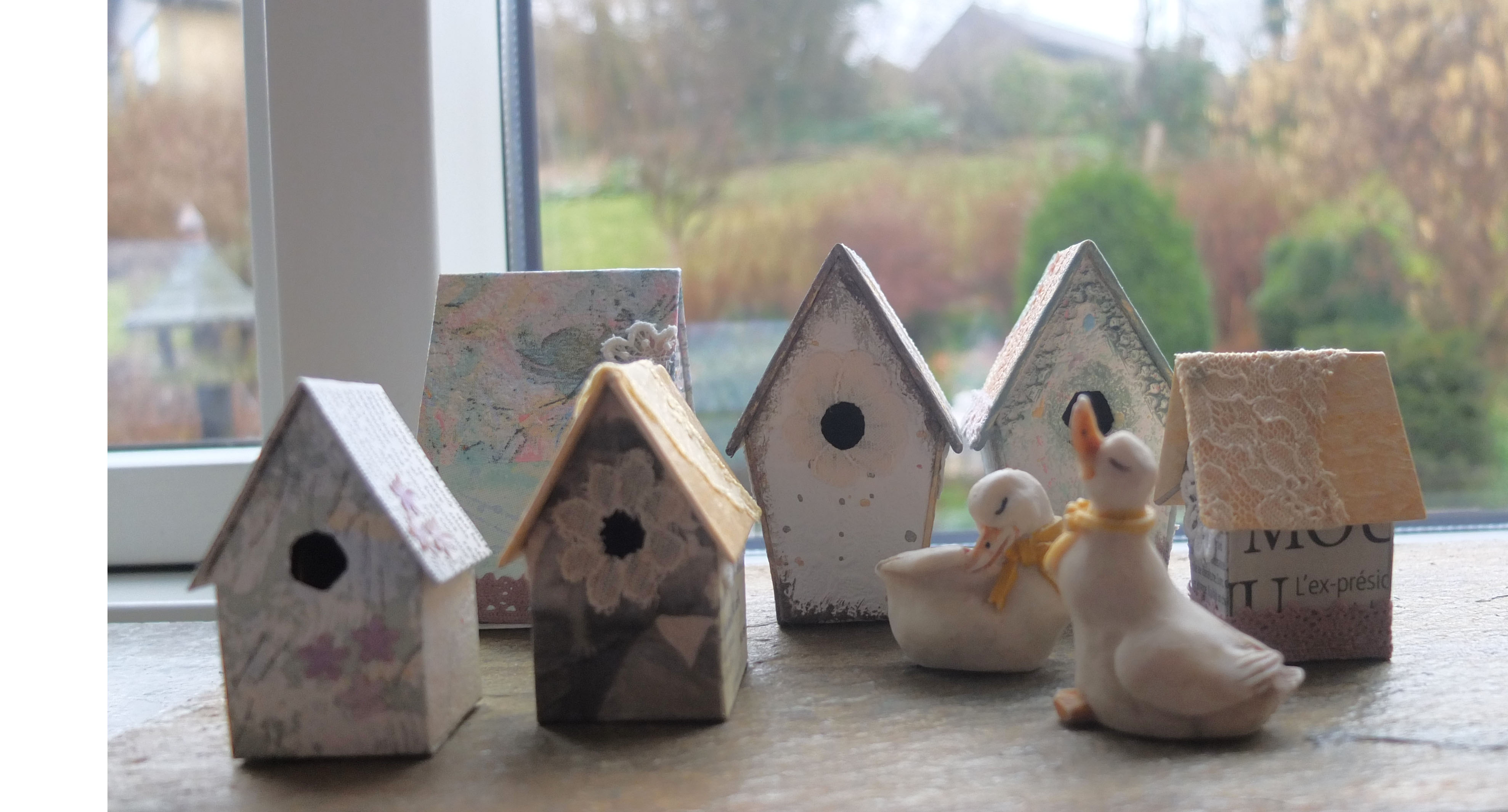 Disse små fuglehuse er nemme at lave at pap og papir eller tapet rester. De er dekoreret med blonderester og små udstansede blomster. Højde: 5 – 8 cm.