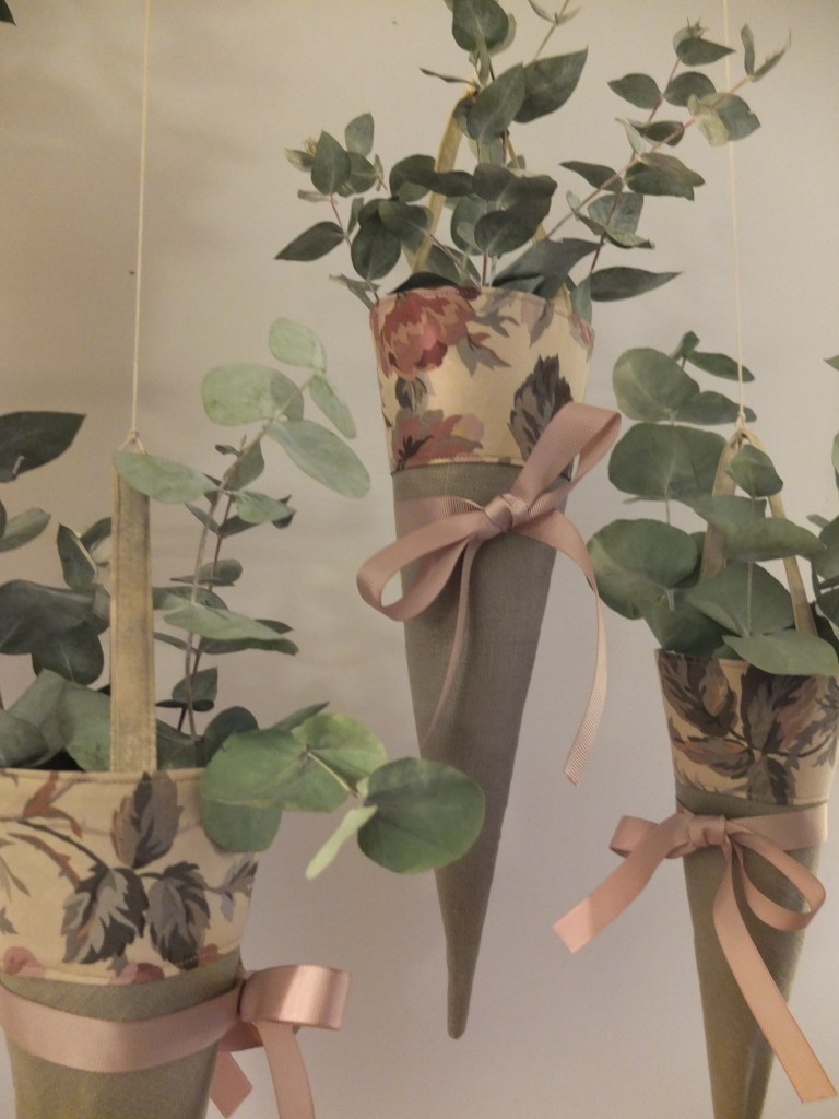 De er syet af hørstof og dekoreret med div. stofrester på begge sider af huset.